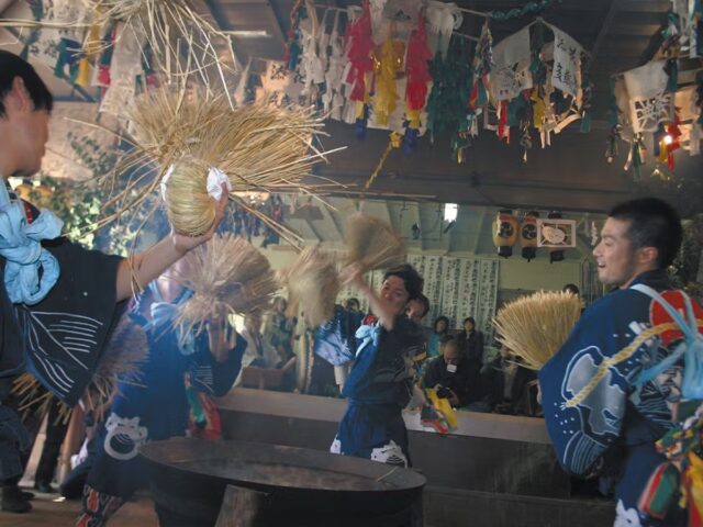 この祭りは、9世紀頃に行われていた湯立神事がほぼそのまま伝承されている貴重な例。神社内に湯釜を設け、一昼夜をかけて神事や舞を奉納します。