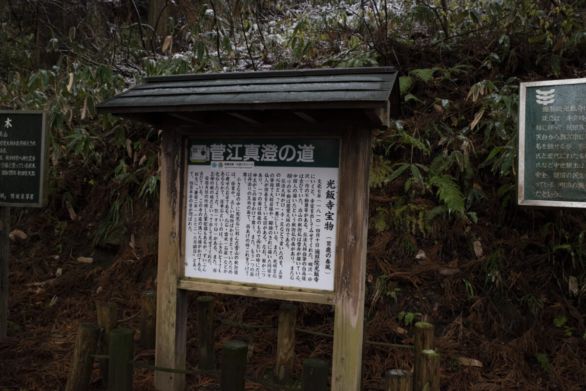 拝殿の左横に伸びるのは、本殿へと通じる道であり、“お山かけ”として親しまれている、登山口。かつては修験場として利用されていました。頂上に向かうにはかなりの時間を要するようで、時間や天候の関係で今回は断念。暗い雪道……怖いですよね…。
