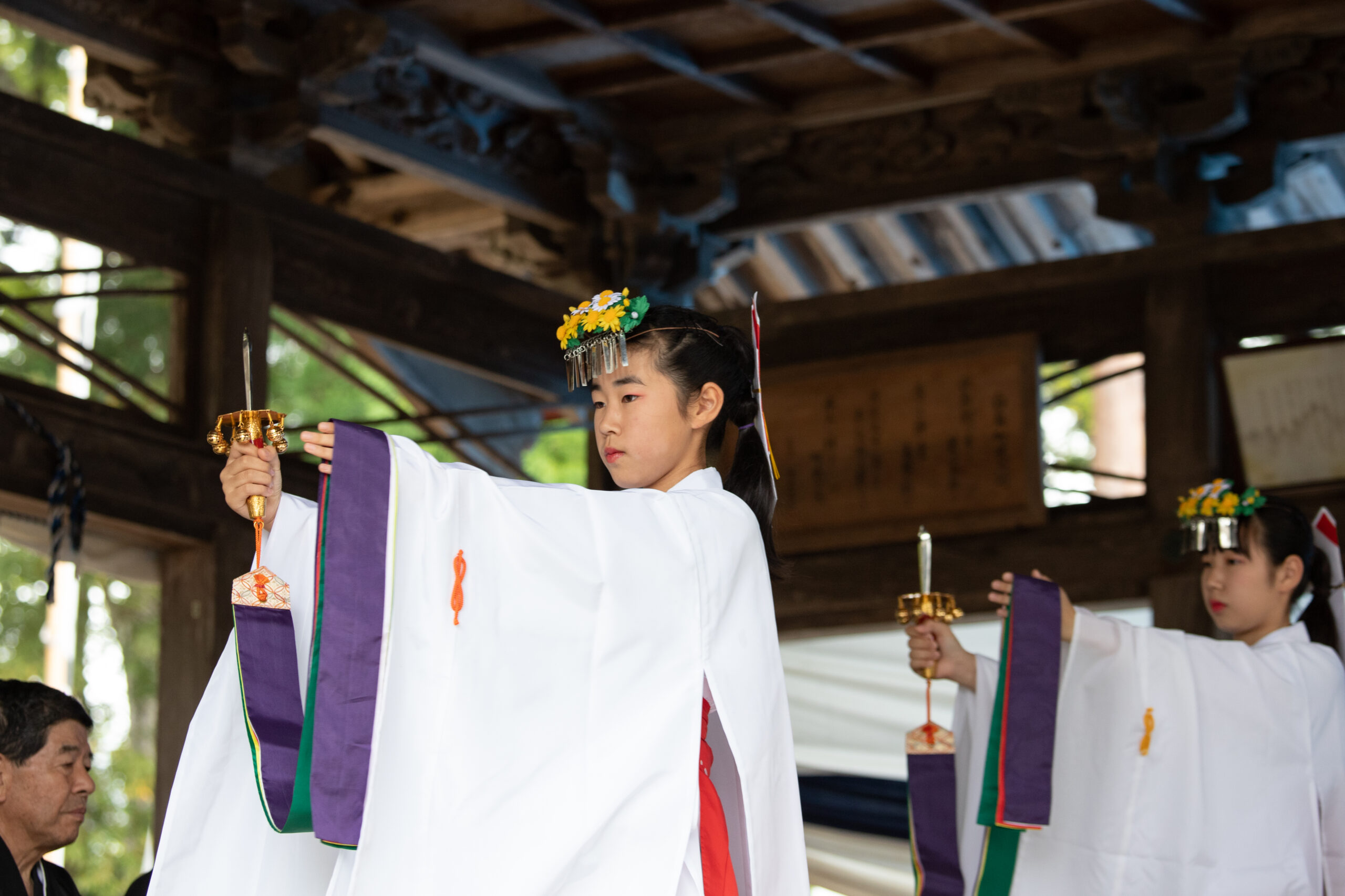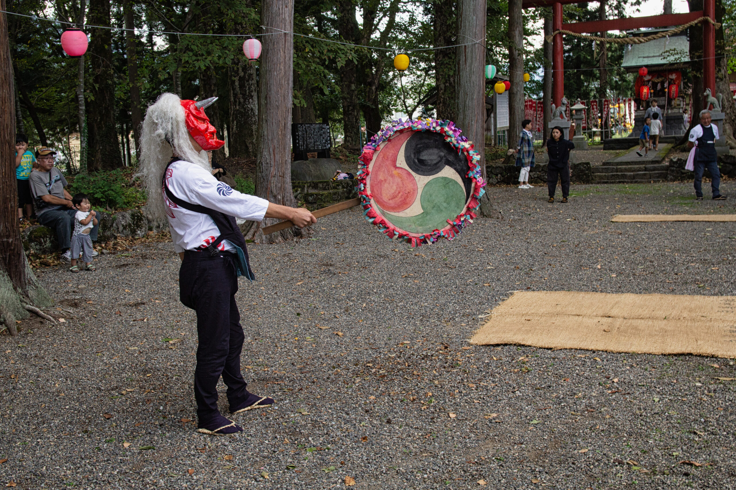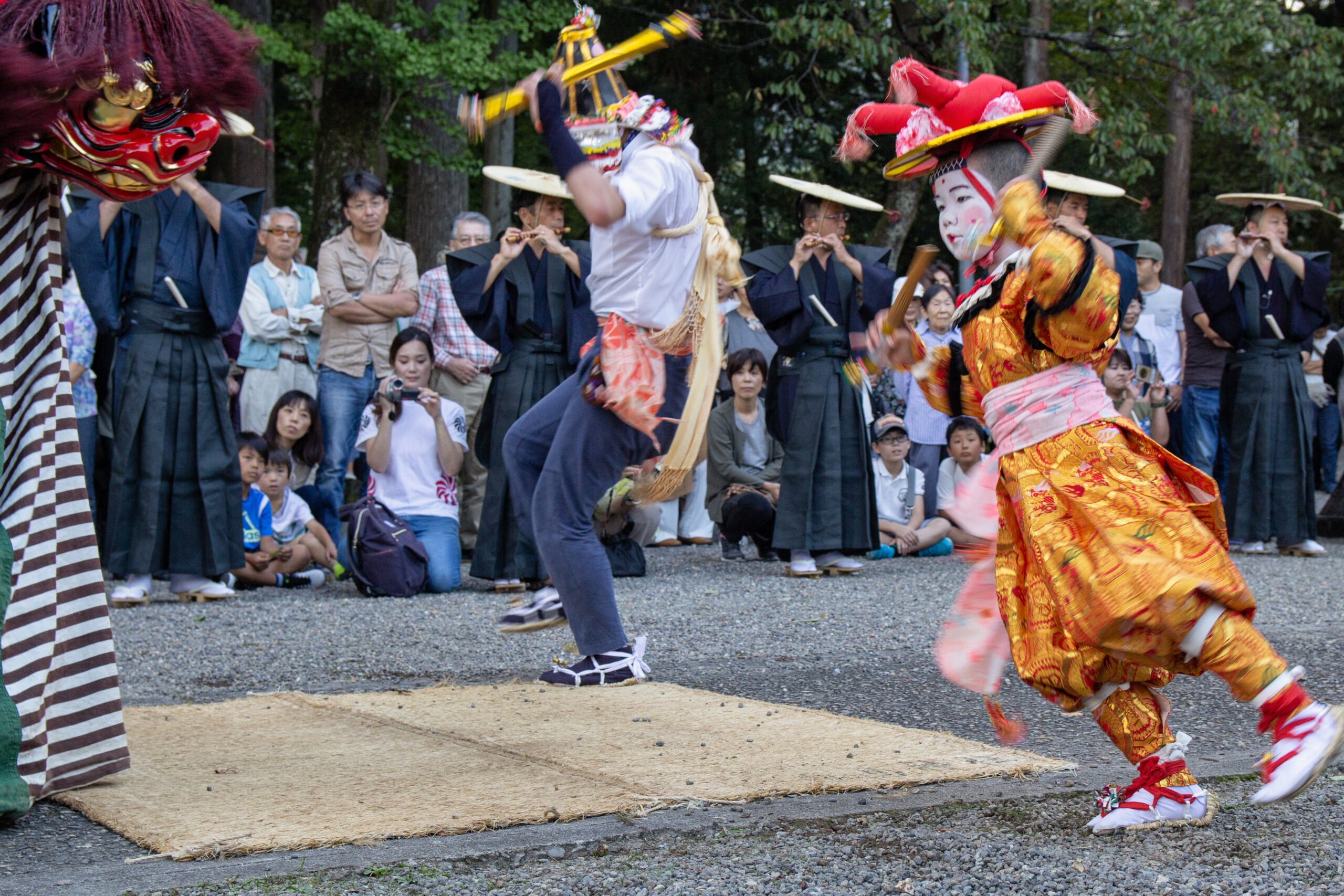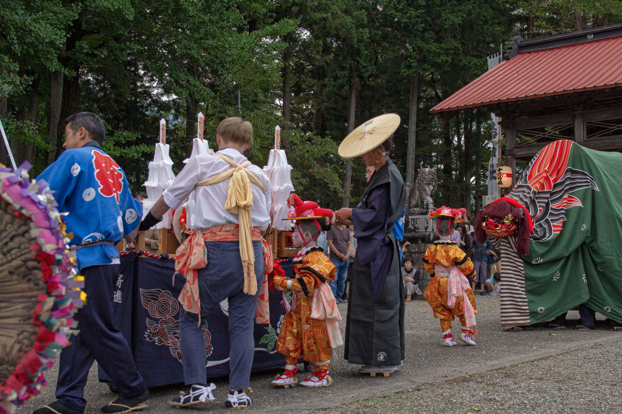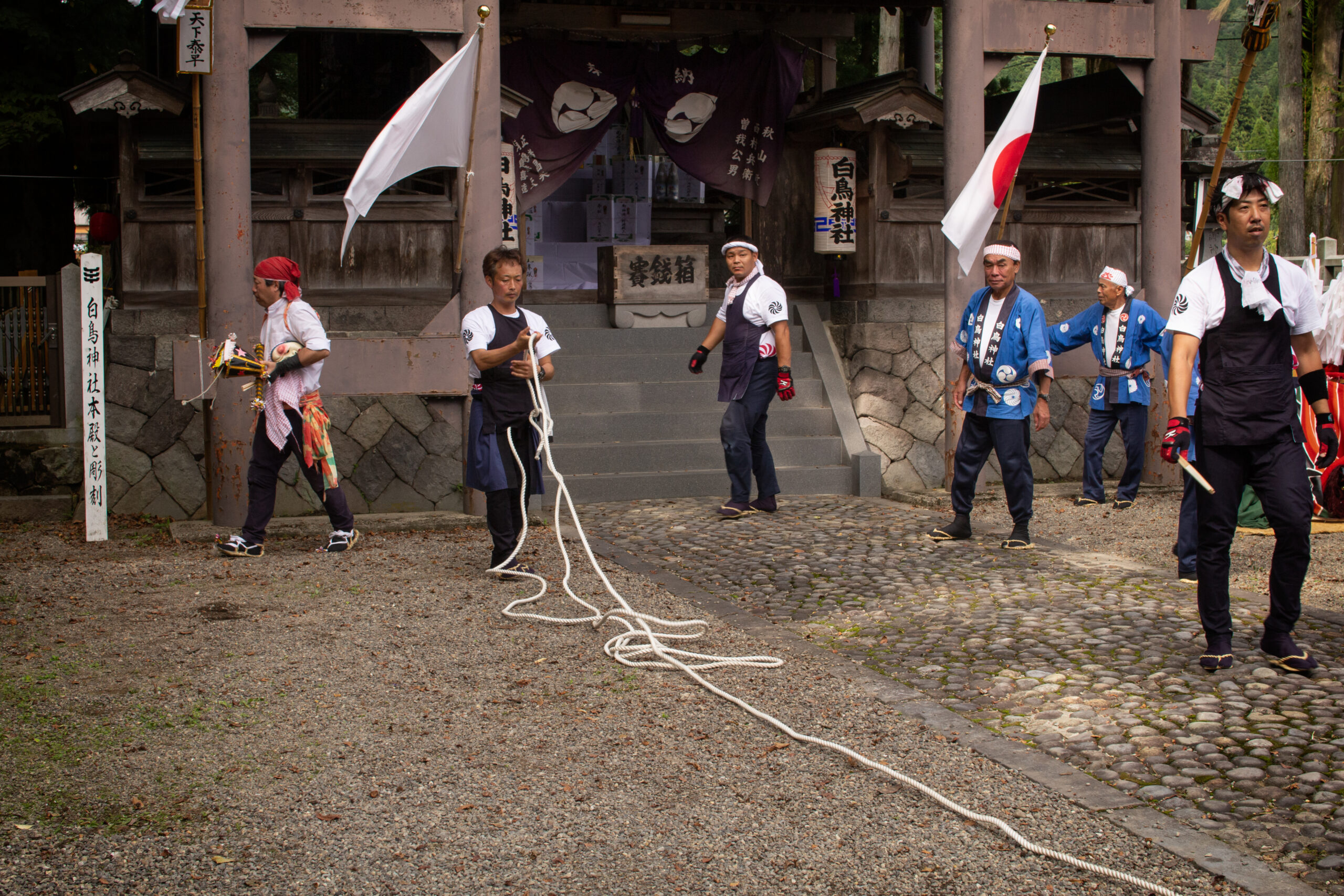 岐阜県郡上市白鳥町(ぐじょうししろとりちょう)は、徹夜で踊る熱狂的な盆踊り「白鳥おどり」があり、多くの盆踊りファンに愛されている。その白鳥町で、長い盆踊りシーズンの終盤、秋の収穫の訪れとともに行われるおまつりが、獅子舞が登場する大神楽(だいかぐら)である。2日間かけ、神社などでの奉納舞と神事、地区を巡行しての舞が行われる。郡上市の無形民俗文化財に指定されている。