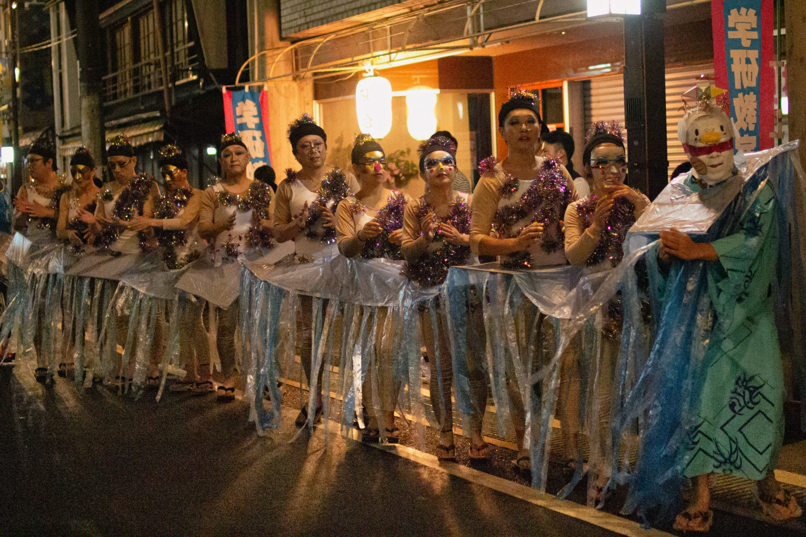 「すっとこどん」の、帽子の不思議な今っぽさ、いつも新しそうなお面、なぜか1人だけ白シャツという規定になっている衣装に、古いおまつりに少しずつ現代性を折り込み、今と昔とを共存させている白鳥の人のたくましい工夫や、若者のパンクな精神の一端が現れているようにも私は感じる。