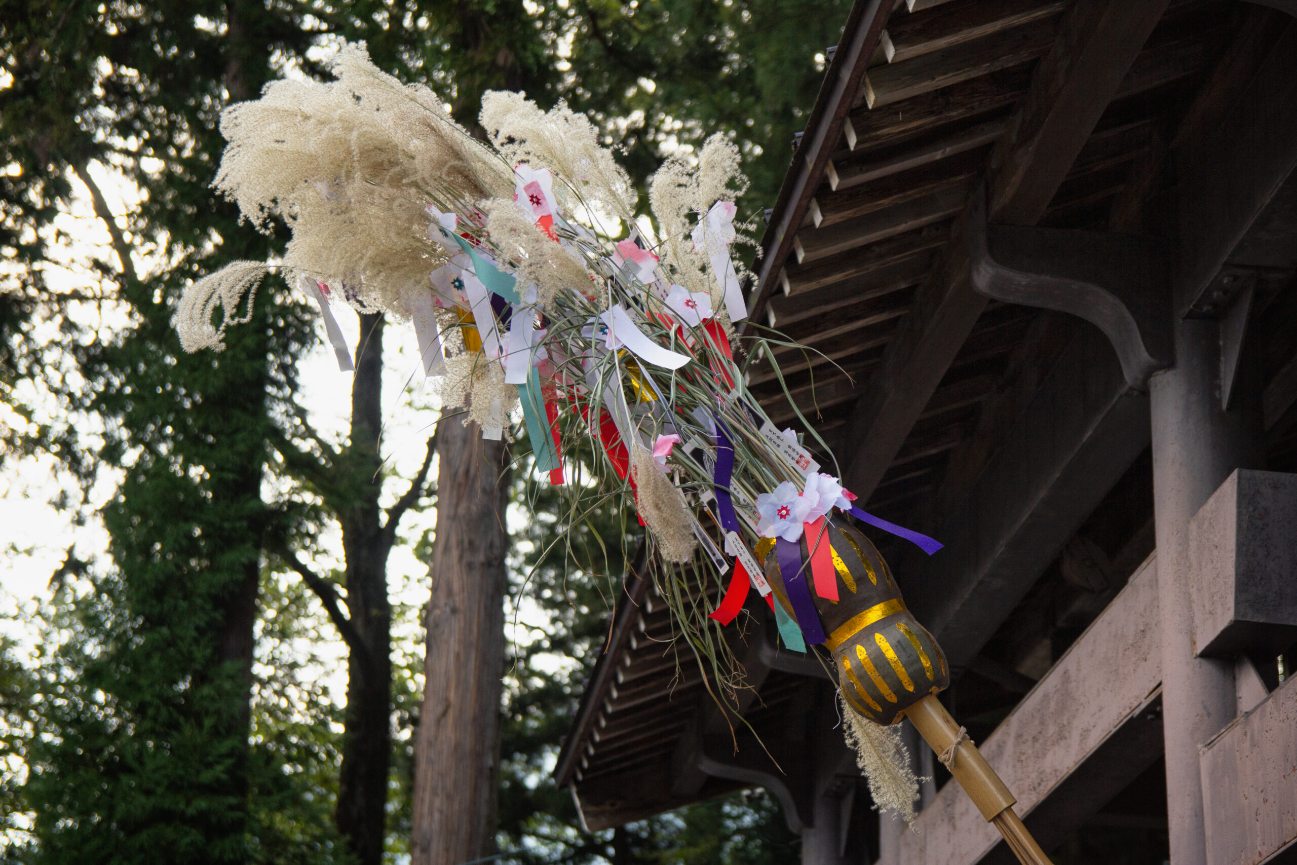 ススキに神社名の短冊、和紙で作った桜の花などのついた出花。(写真:渡辺 葉)