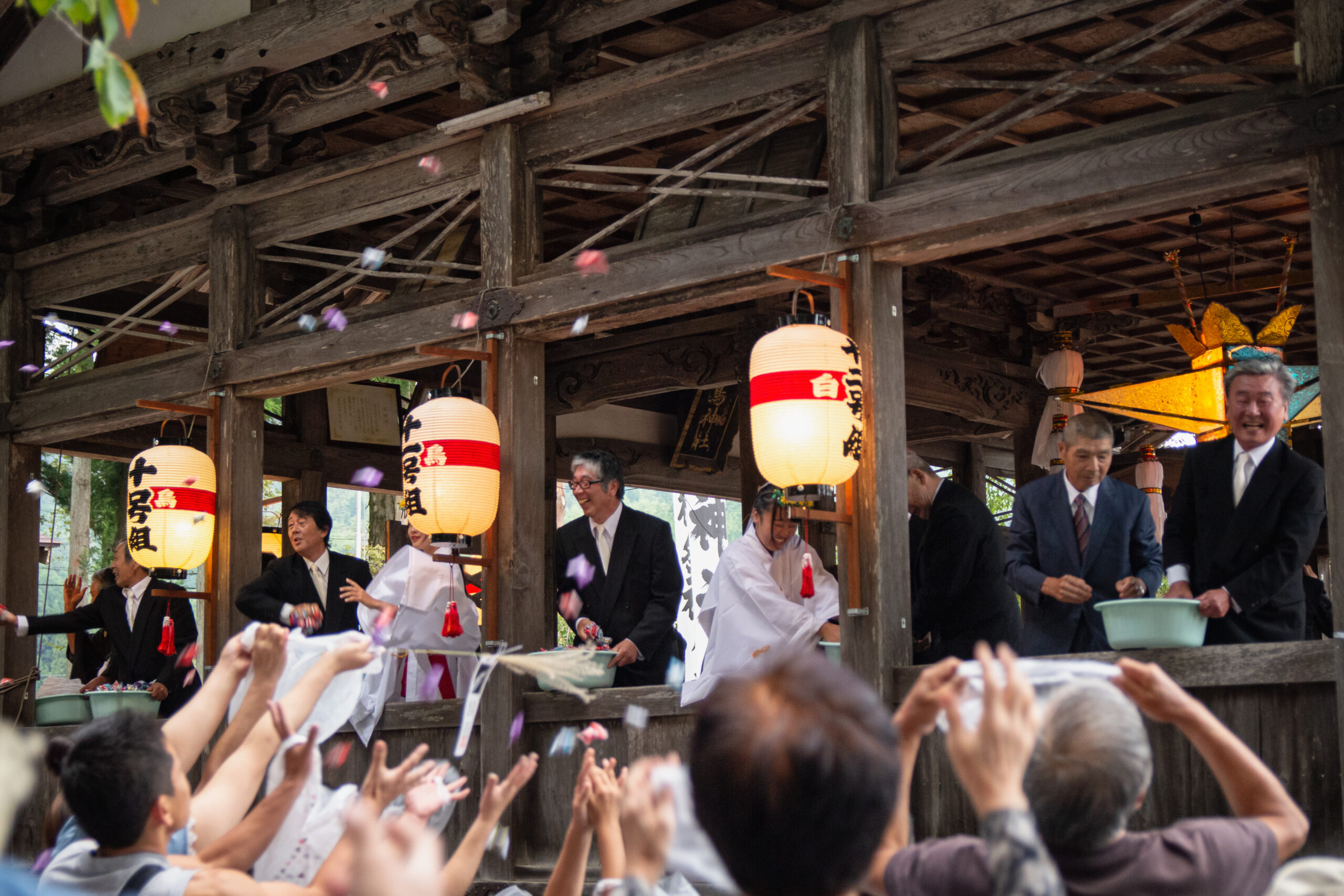 かつて出花は観客に奪い合われたそうだ。現在は出花を激しく奪い合わない代わりに、役員と巫女による飴まきがあり、当たりくじつきの飴が奪い合われている。賞品には、参加してみたところ家電製品などもあって、なかなか豪華だった。白鳥町のおまつりに行くと、しょっちゅう飴などの菓子や餅がまかれる光景に出くわす。