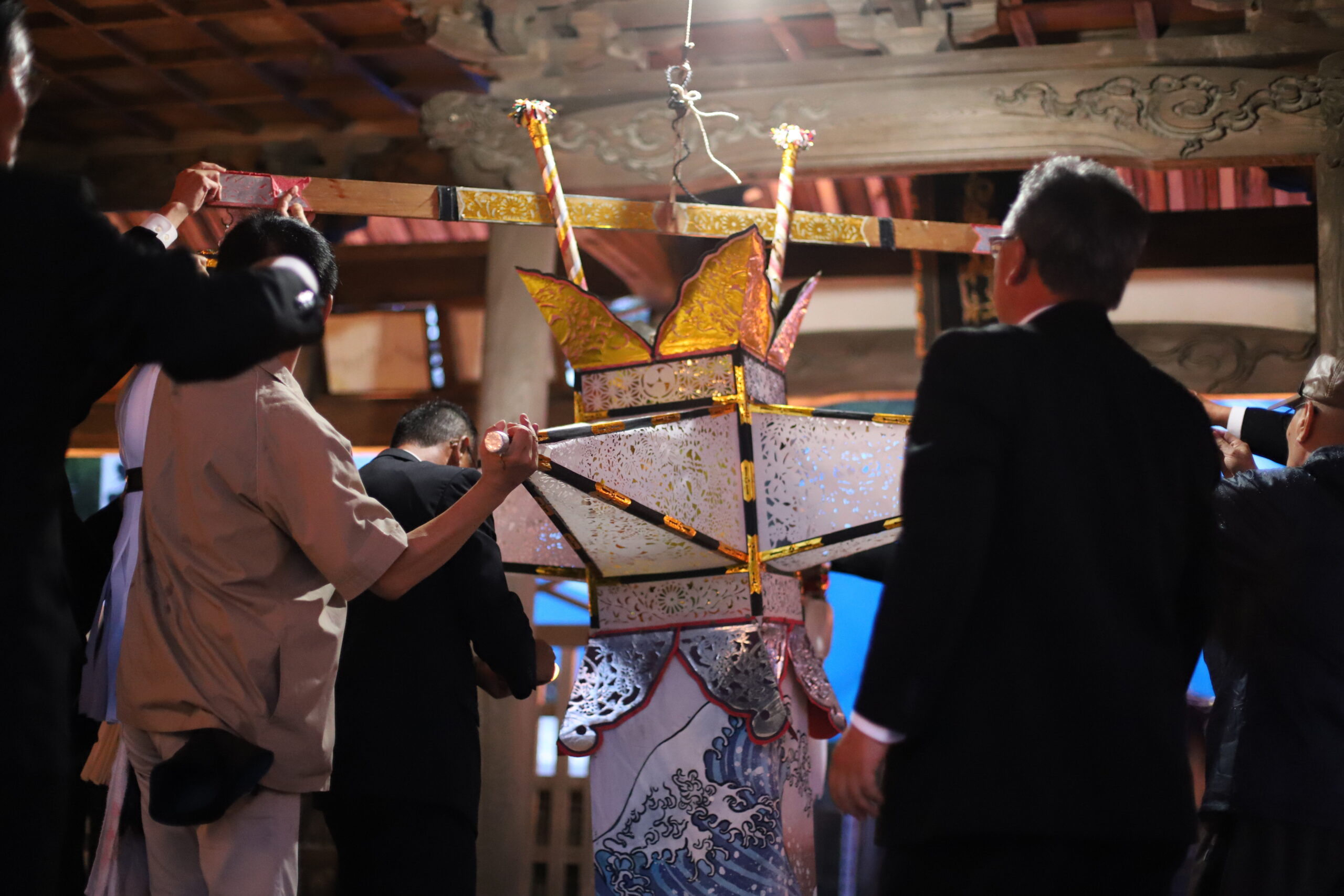 大神楽終了後、キリコ灯篭(とうろう)を吊るす関係者。和紙で細かい細工がされて、幕には白山や白浪が描かれている。灯篭は神とご先祖への目印となる。(写真:渡辺 葉)