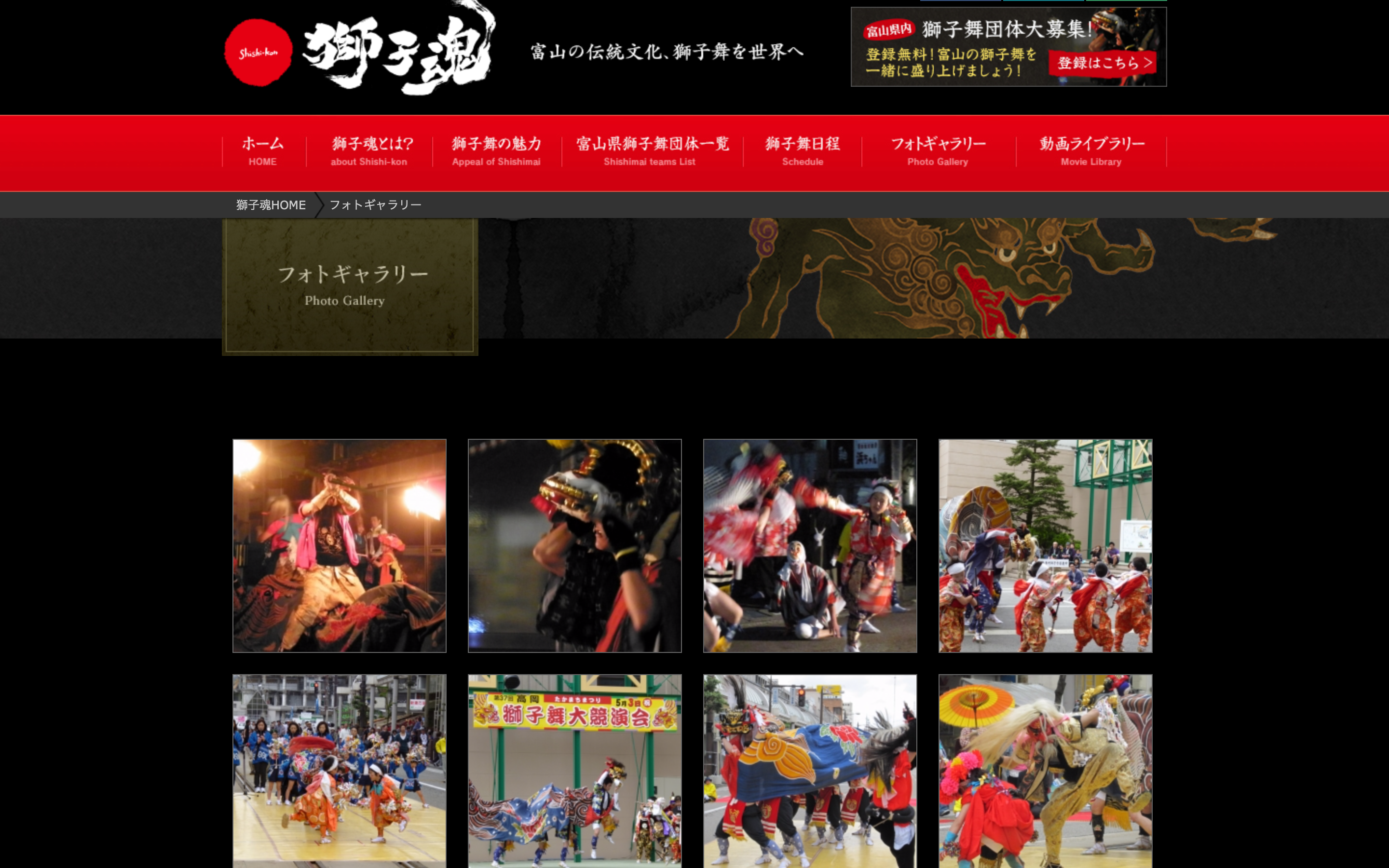 そのほかに、獅子舞の日程がカレンダー形式でまとまっていたり、写真や動画が見られるコーナーがあったりする。更新を必要とする情報もあるようだが、実際に富山県の獅子舞はいつ見られるのかということや、ビジュアル的なイメージとともに、獅子舞の生きた情報に触れることができる。