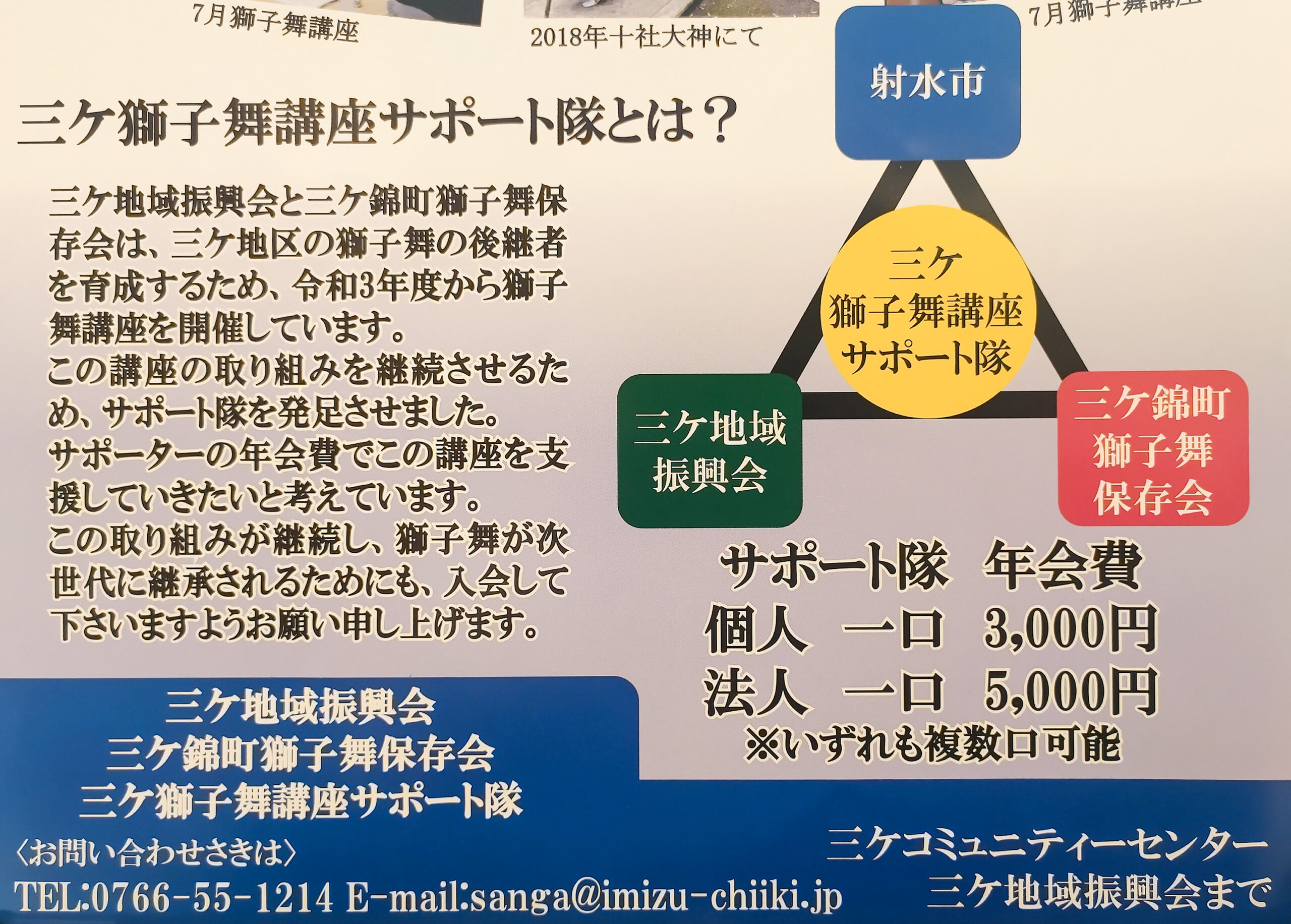 このパンフレットの図を見ていただきたい。射水市、三ヶ地域振興会、三ヶ錦町獅子舞保存会の3者が協力して獅子舞講座を運営しながらも、個人・法人会員からなる「三ヶ獅子舞講座サポート隊」の年会費によって支援されているのだ。