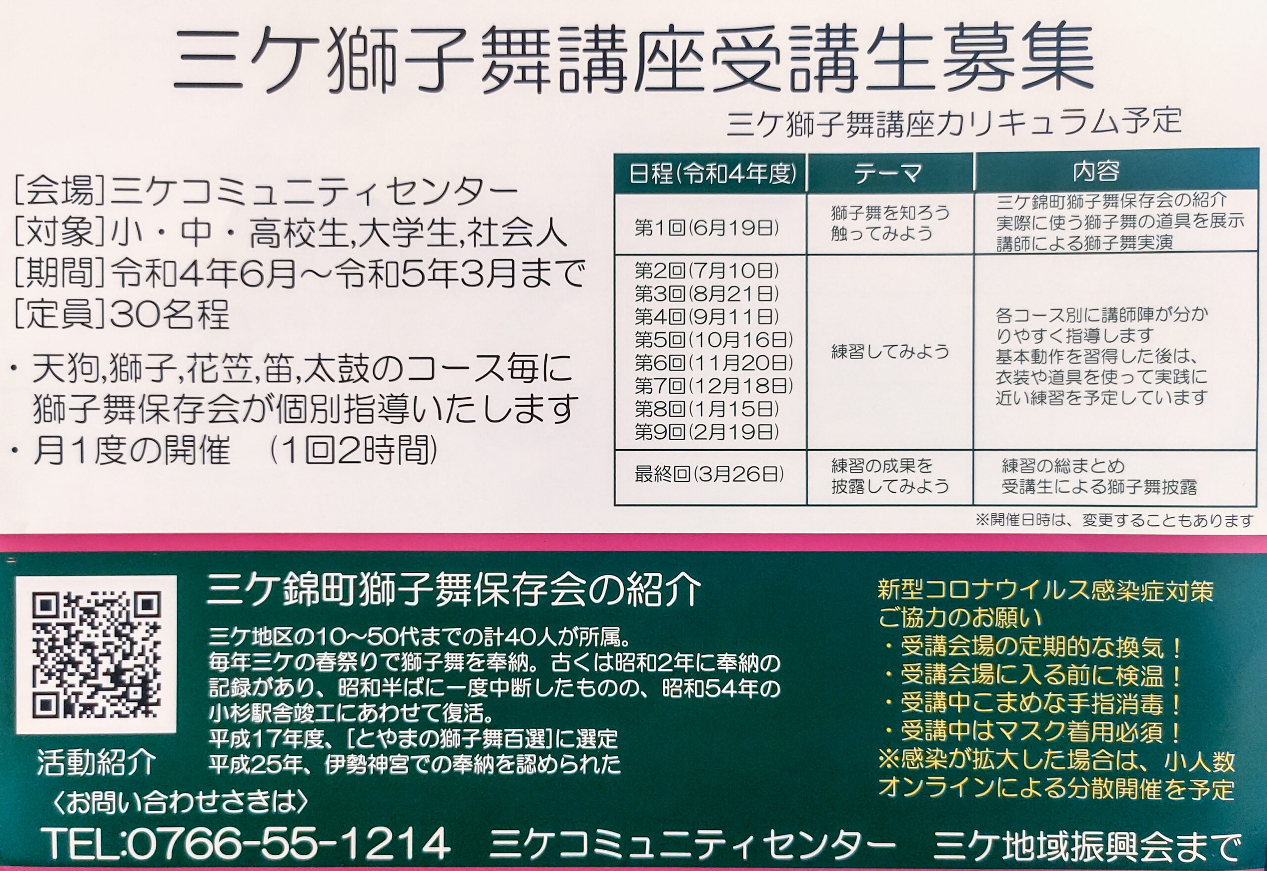 これによって完全に補助金に頼り切らず、地域からの支援をもらうことで、自立した資金源の確保に成功している。この講座を運営している方の一人は「皆で理解して皆で支え合うことで、補助金に頼り切らず持続可能な仕組みを整えられる」とおっしゃっていた。「三ヶ獅子舞講座サポート隊」に興味がある方は、上記画像内か文末に再掲するお問い合わせ先までご連絡いただきたい。