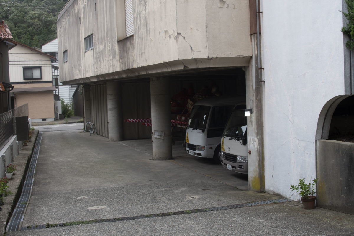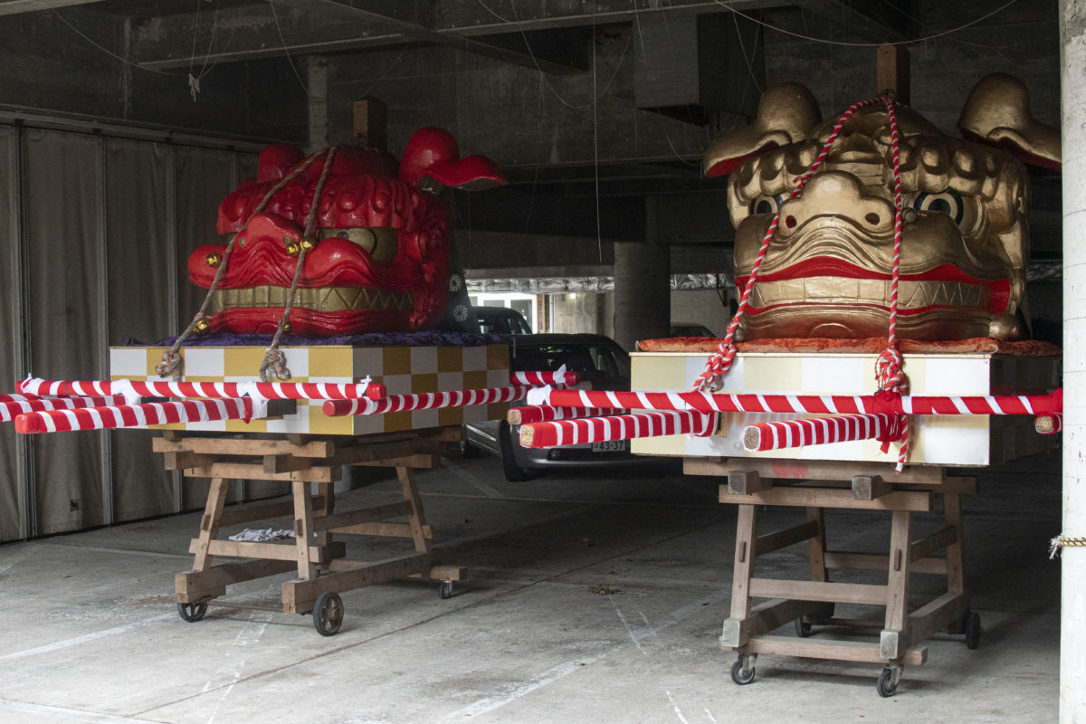 また、9月下旬のこいこい祭り当日近くになると、御輿の獅子が消防署の車庫に運ばれます。町を散歩していて発見したのですが、一見すると普通の車庫です。しかし、よくみると、御輿の取っ手が少し見えています。まるで、かくれんぼをしているようですね。