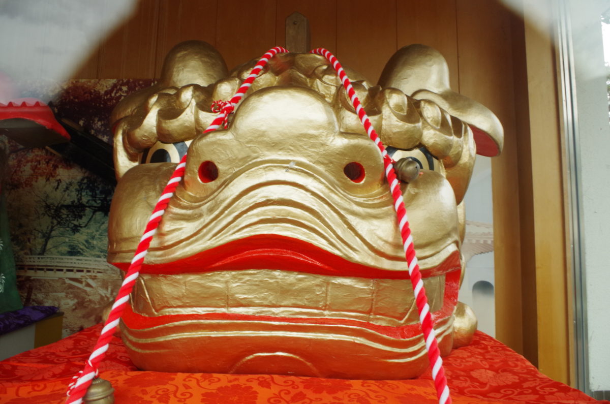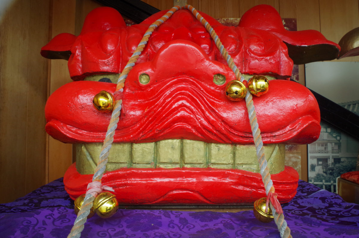 こちらが二体目の若衆みこしの獅子。こちらは顔が赤くて、歯が金色です。赤と金の色の配置が一体目と逆ですね。