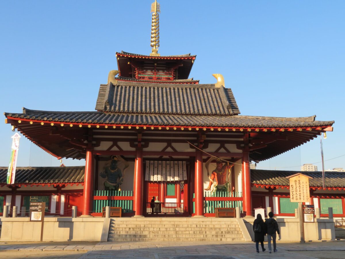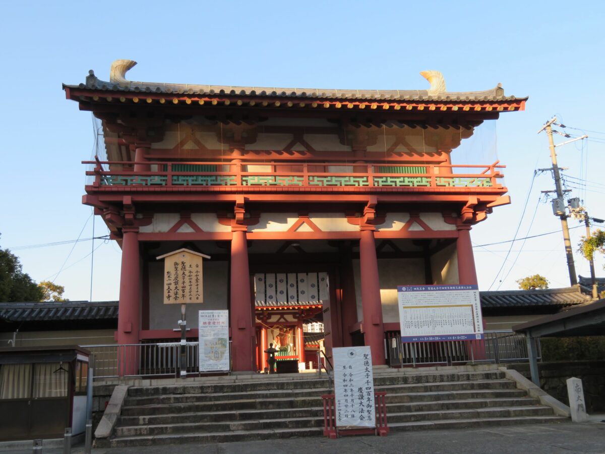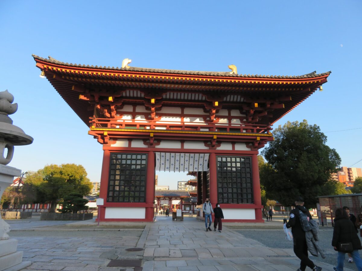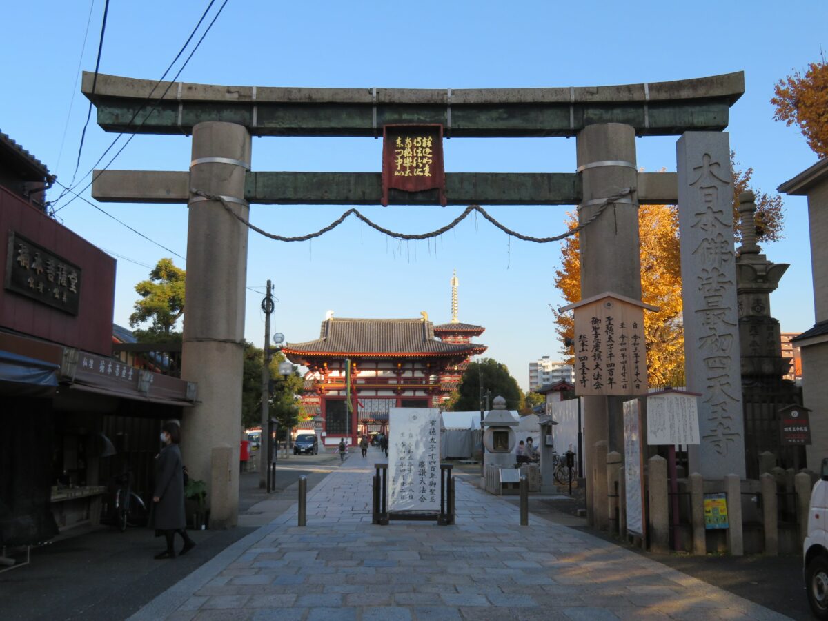 四天王寺は大阪メトロ谷町線の四天王寺前夕陽ヶ丘駅から南東に約500メートルに伽藍を構えています。駅からの一本道を直進すれば、境内の北西端に建つ中之門です。