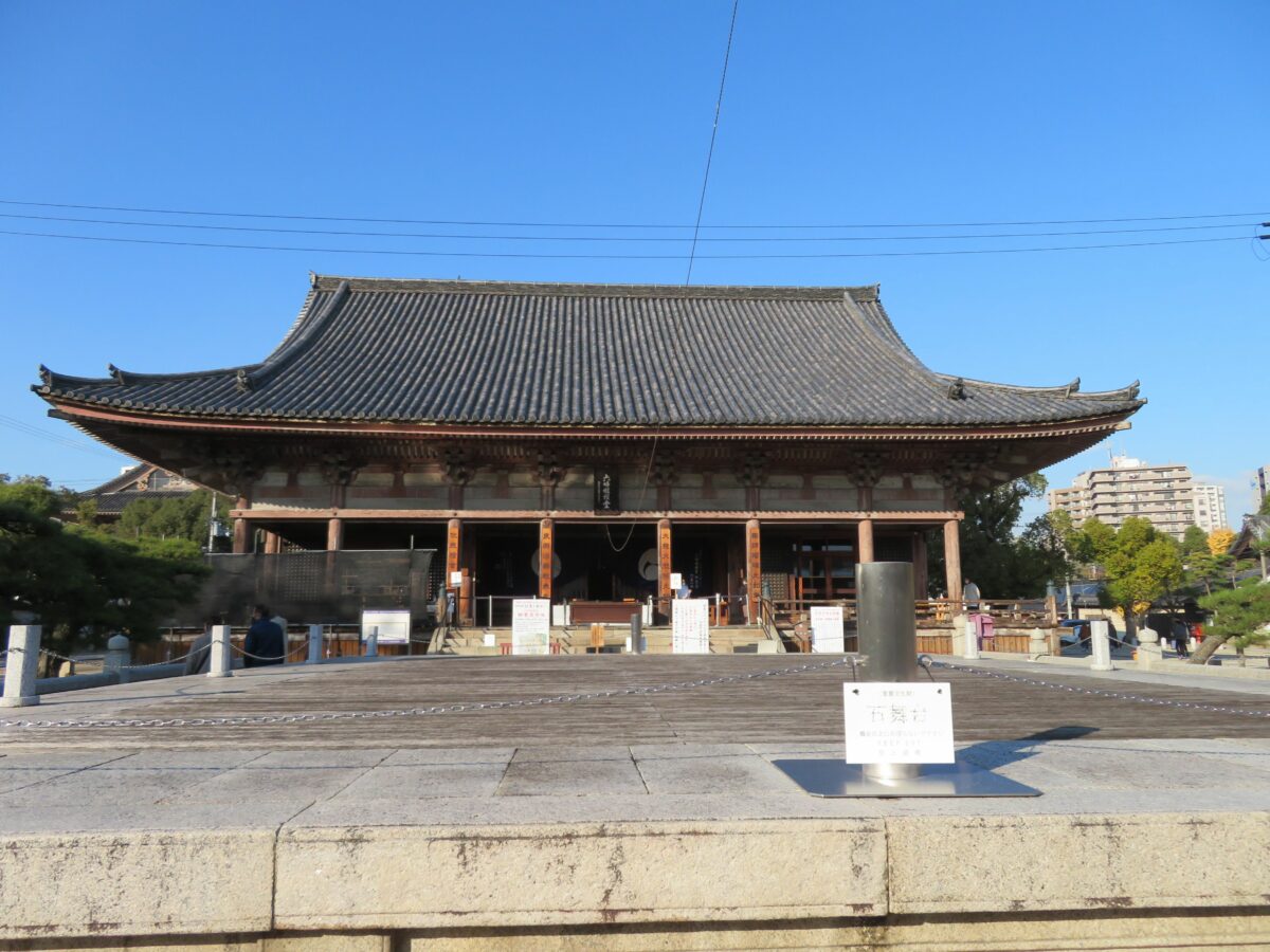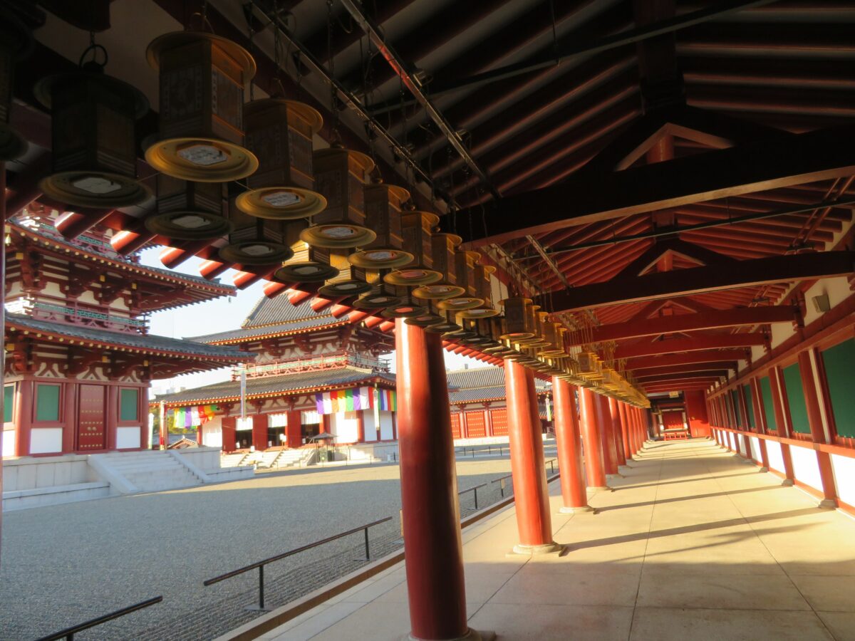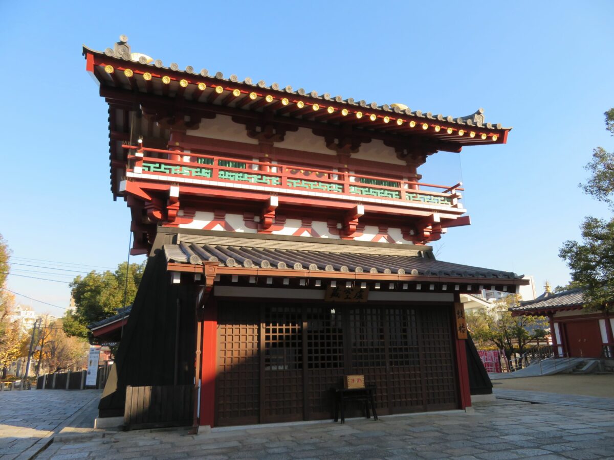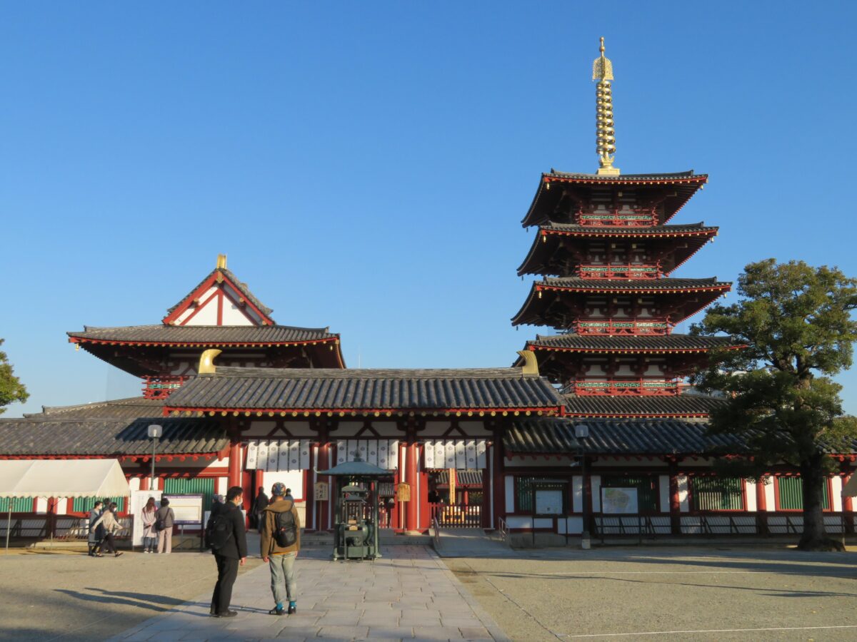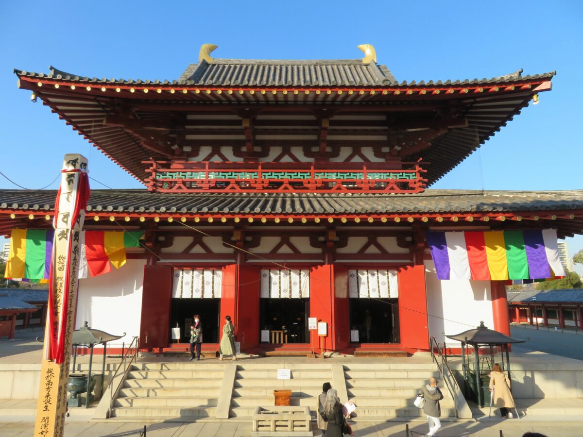 四天王寺は大阪メトロ谷町線の四天王寺前夕陽ヶ丘駅から南東に約500メートルに伽藍を構えています。駅からの一本道を直進すれば、境内の北西端に建つ中之門です。