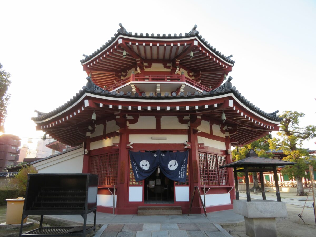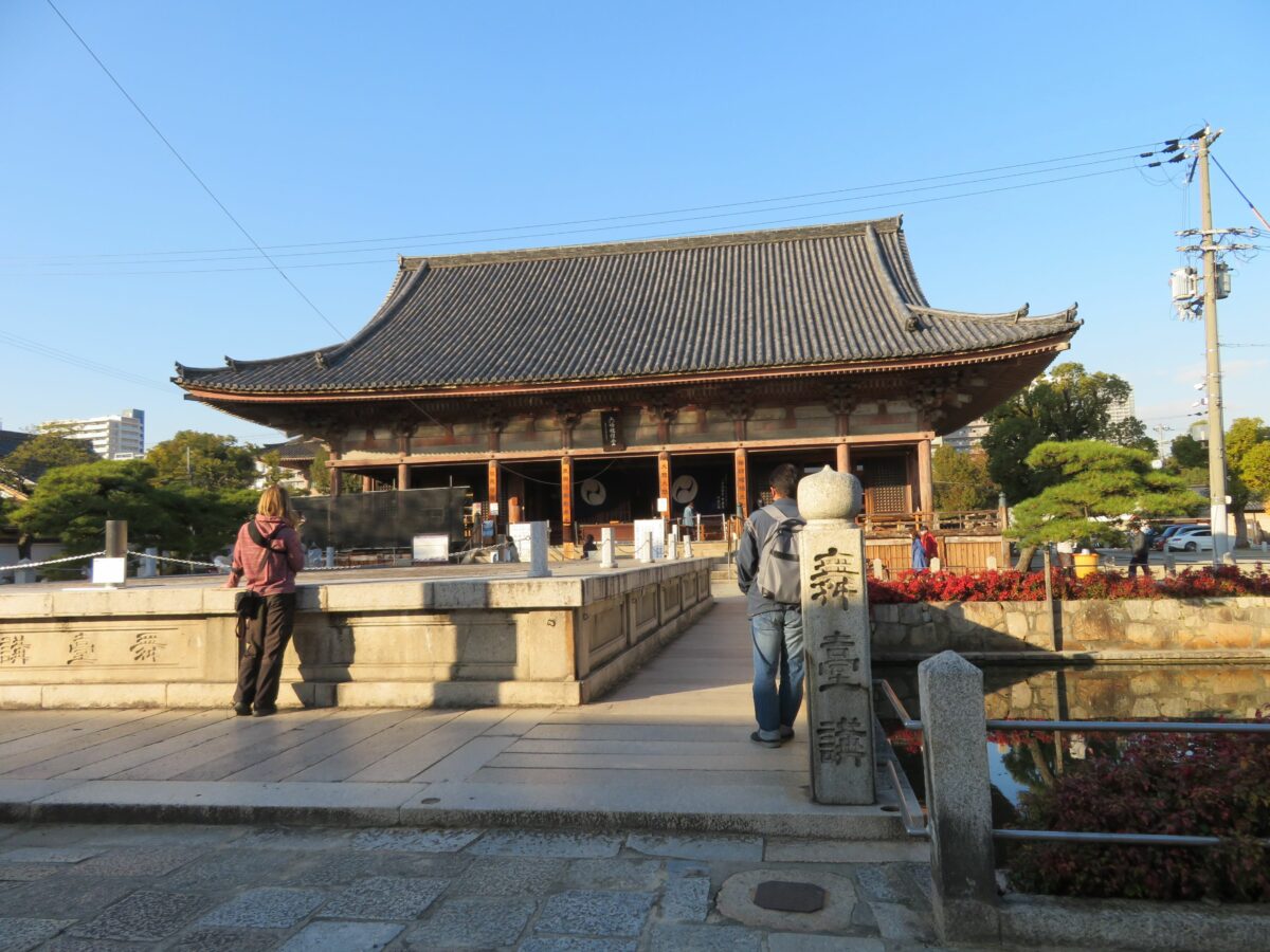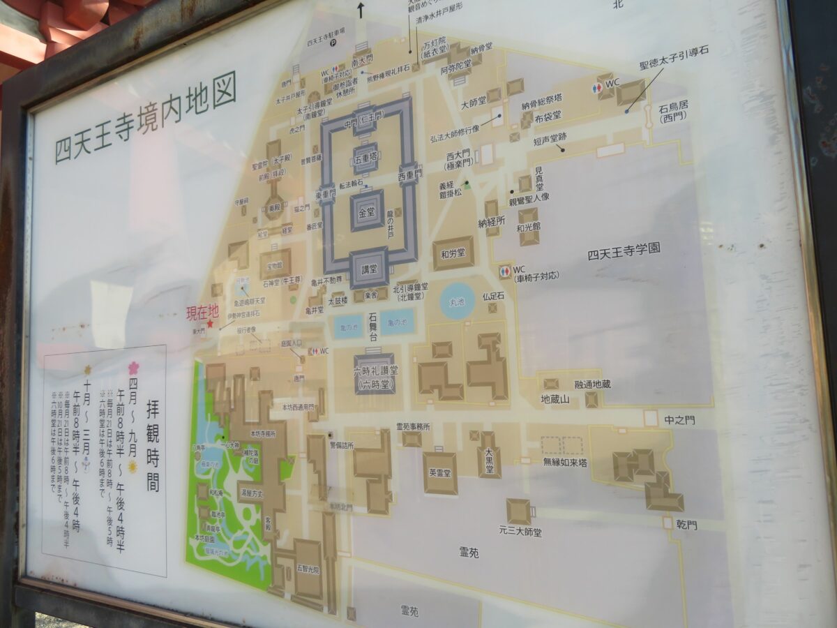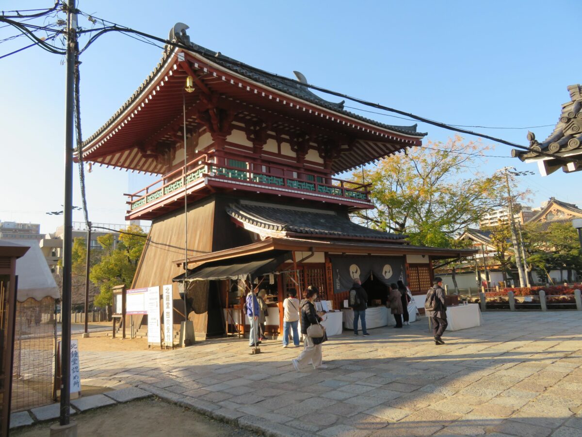 四天王寺は大阪メトロ谷町線の四天王寺前夕陽ヶ丘駅から南東に約500メートルに伽藍を構えています。駅からの一本道を直進すれば、境内の北西端に建つ中之門です。