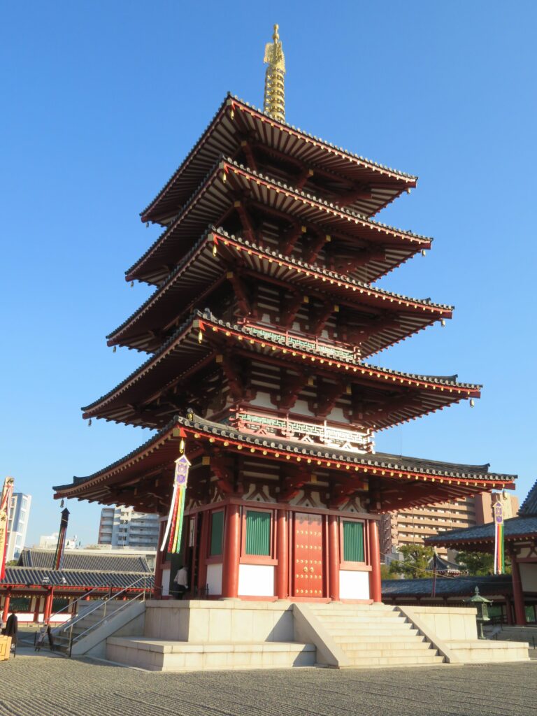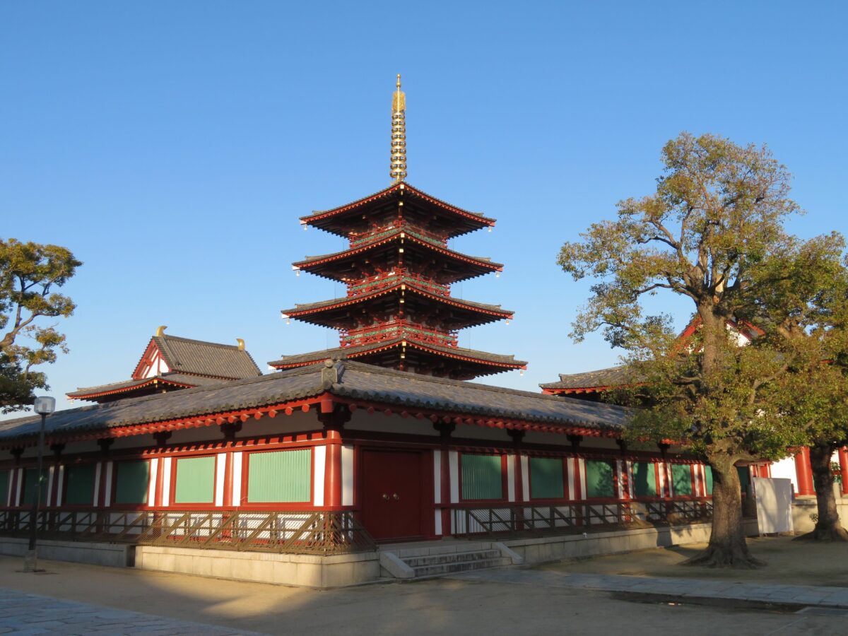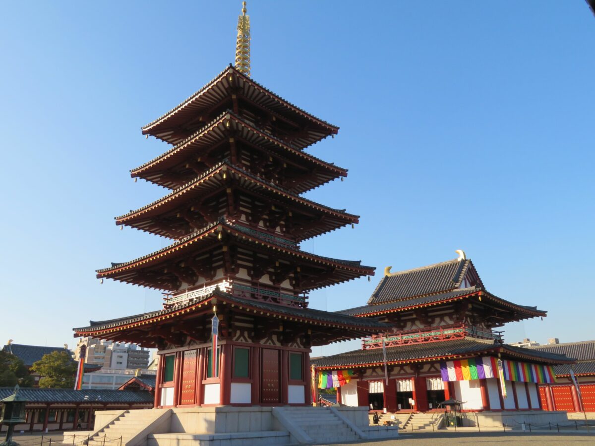 四天王寺は、593年に建立されました。『日本書紀』では聖徳太子が、物部守屋と争った蘇我馬子の戦勝を祈りつつ自ら四天王像を彫り、合戦後に像を安置する寺院を建立したと伝えています。本格的な仏教寺院としては日本で最も古く、聖徳太子建立七大寺の一つとされています。伽藍の配置は「四天王寺式伽藍配置」と呼ばれ、南から北に向かって中門、五重塔、金堂、講堂が一直線に並び、それを回廊が囲んでいます。