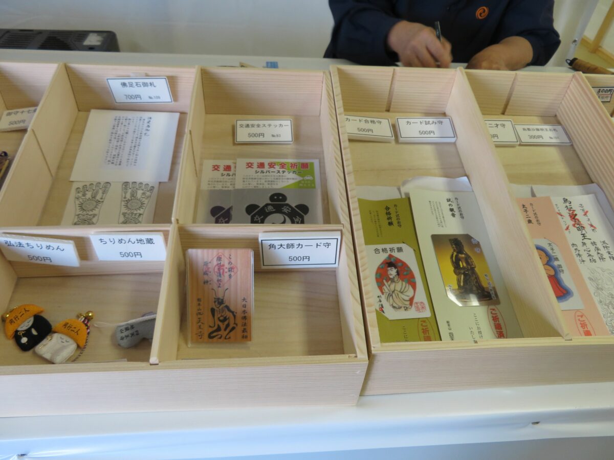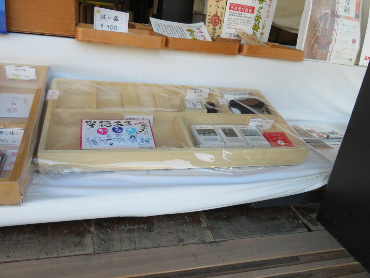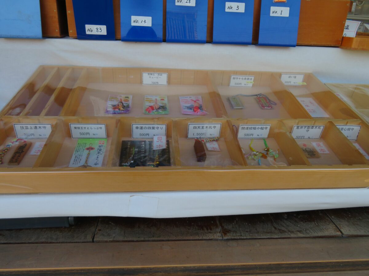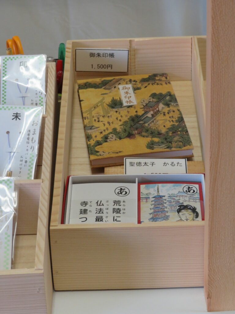 納経所の窓口にはオリジナルの御朱印帳の他に、多種多様の授与品が並んでいます。お守りだけでも数十種類あり、身につけて努力すれば願い事を実らせることができることでしょう。聖徳太子かるたや、絵葉書なども準備されています。
