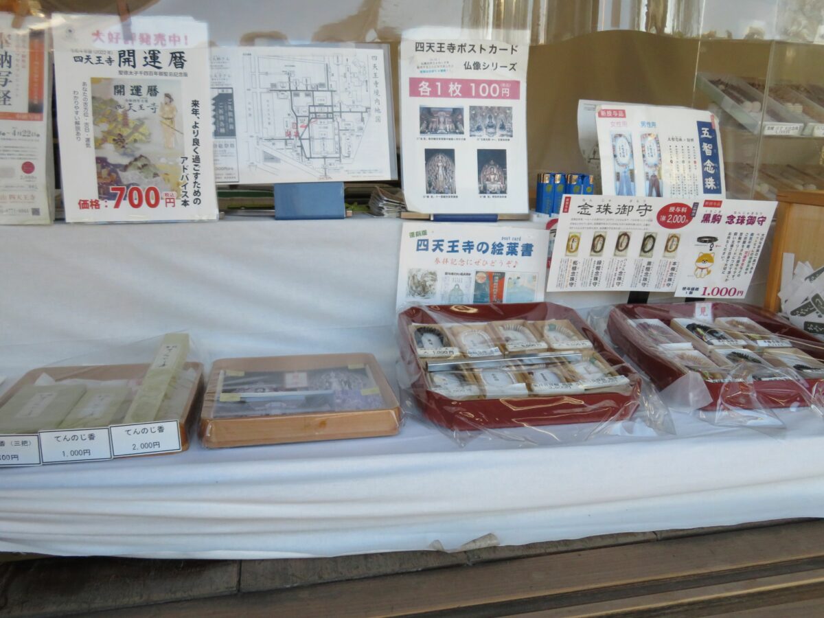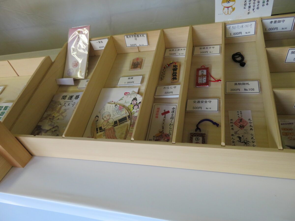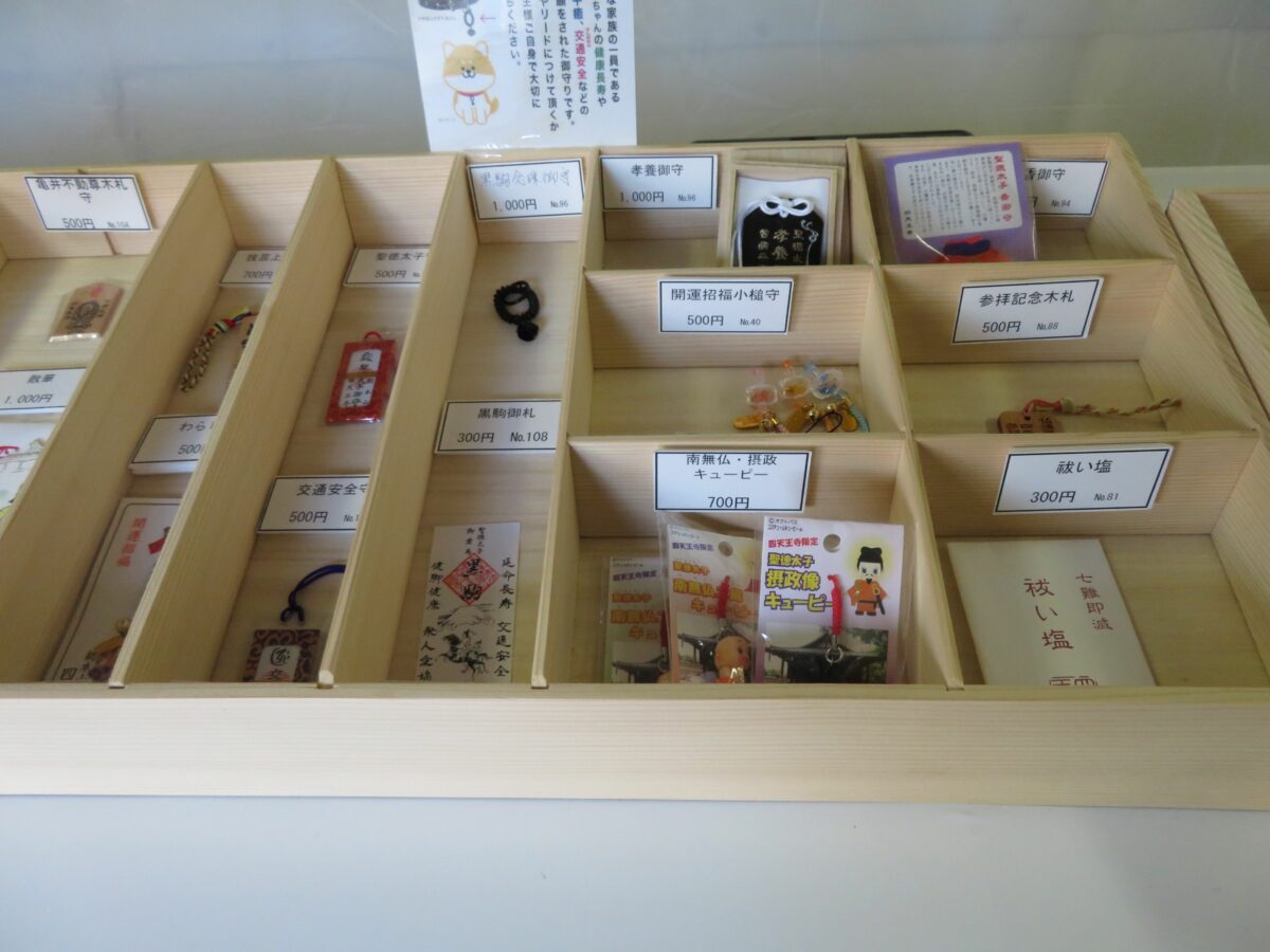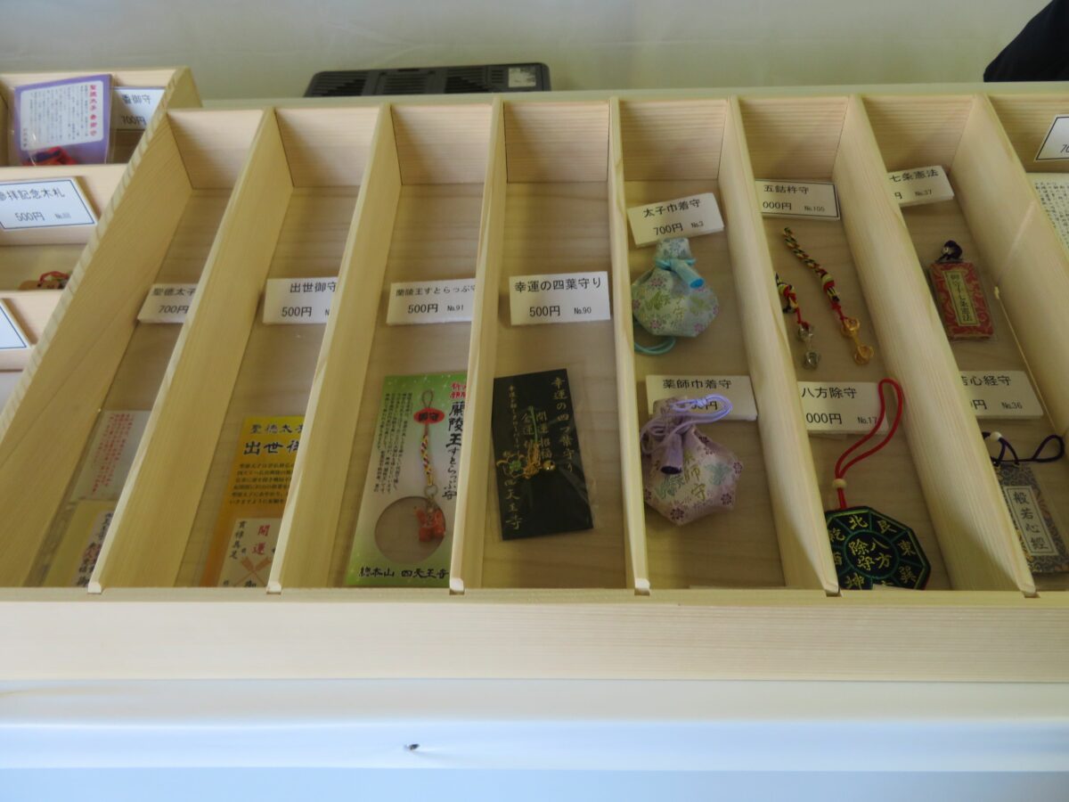 納経所の窓口にはオリジナルの御朱印帳の他に、多種多様の授与品が並んでいます。お守りだけでも数十種類あり、身につけて努力すれば願い事を実らせることができることでしょう。聖徳太子かるたや、絵葉書なども準備されています。
