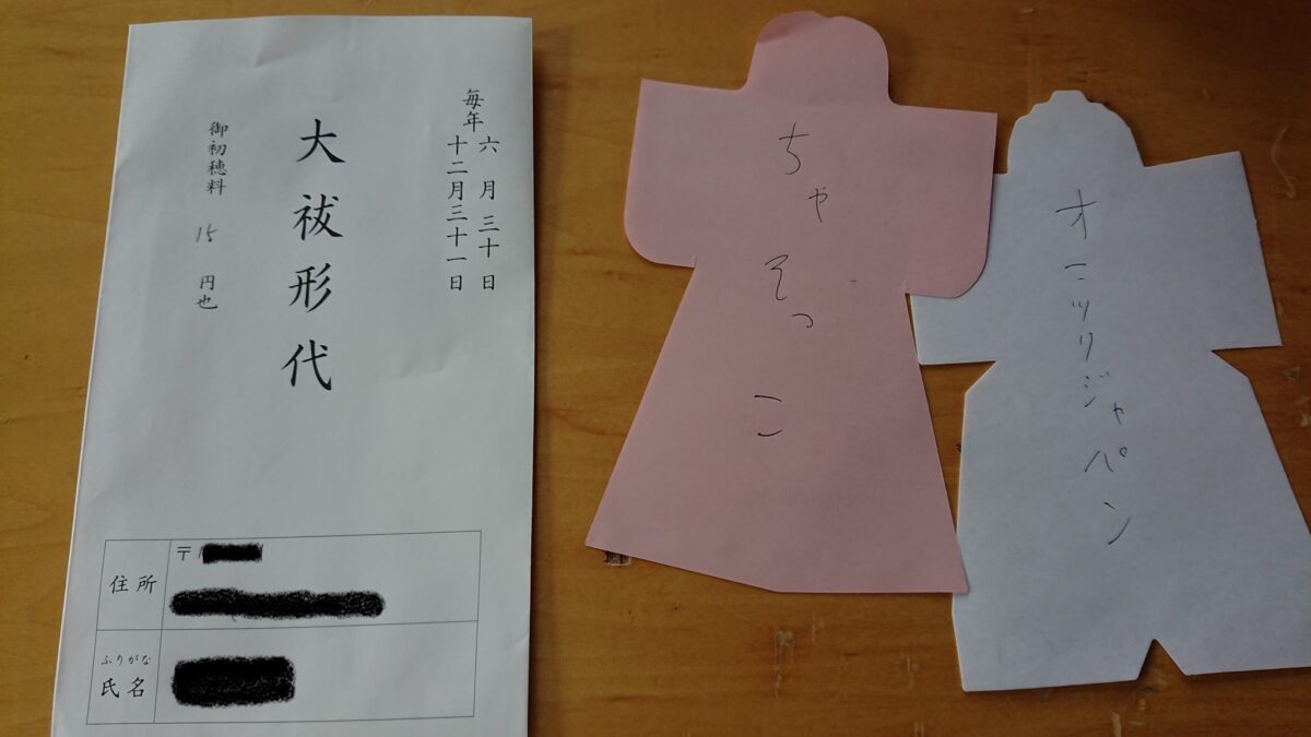 ライターは大祓式がはじめてでよく分からなかったので、まわりの人の見様見真似でやった写真が上のものになります。初穂料15円は駄目だと言われましたが、人形の形代は受付てくれました笑 こちら左の封筒に初穂料1,000円以上を入れ、人形に家族等の一人ひとりの氏名・年齢を記入し、身体の左右左を撫で、息を三度吹きかけるのが正式な扱い方とのことです。大祓式に出たことのない人は参考にしてください。