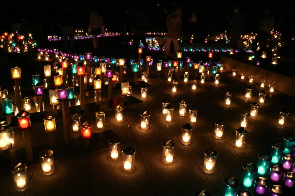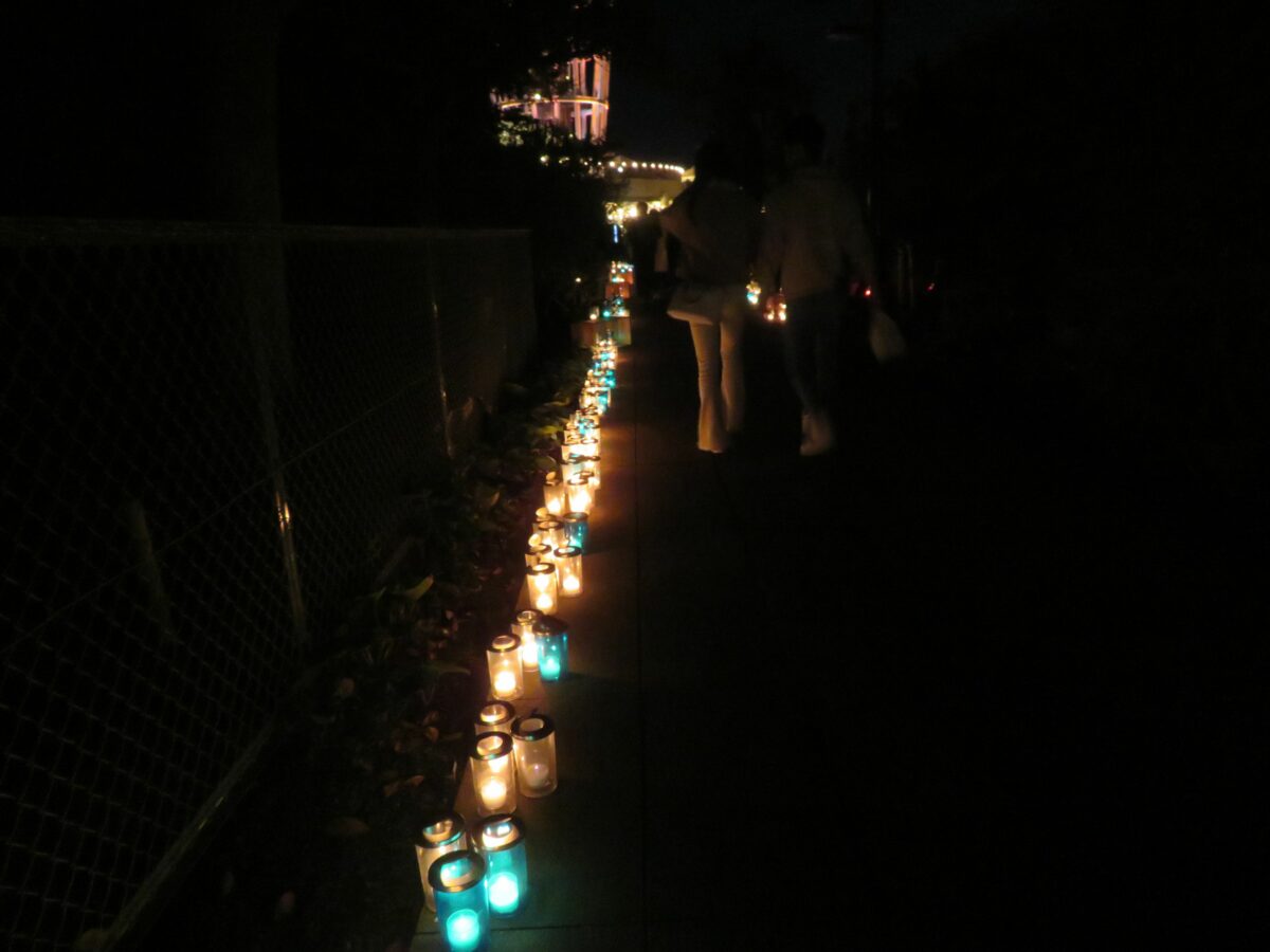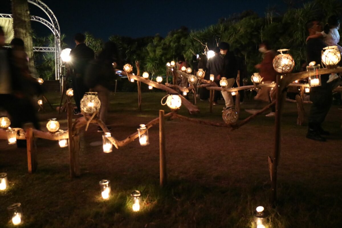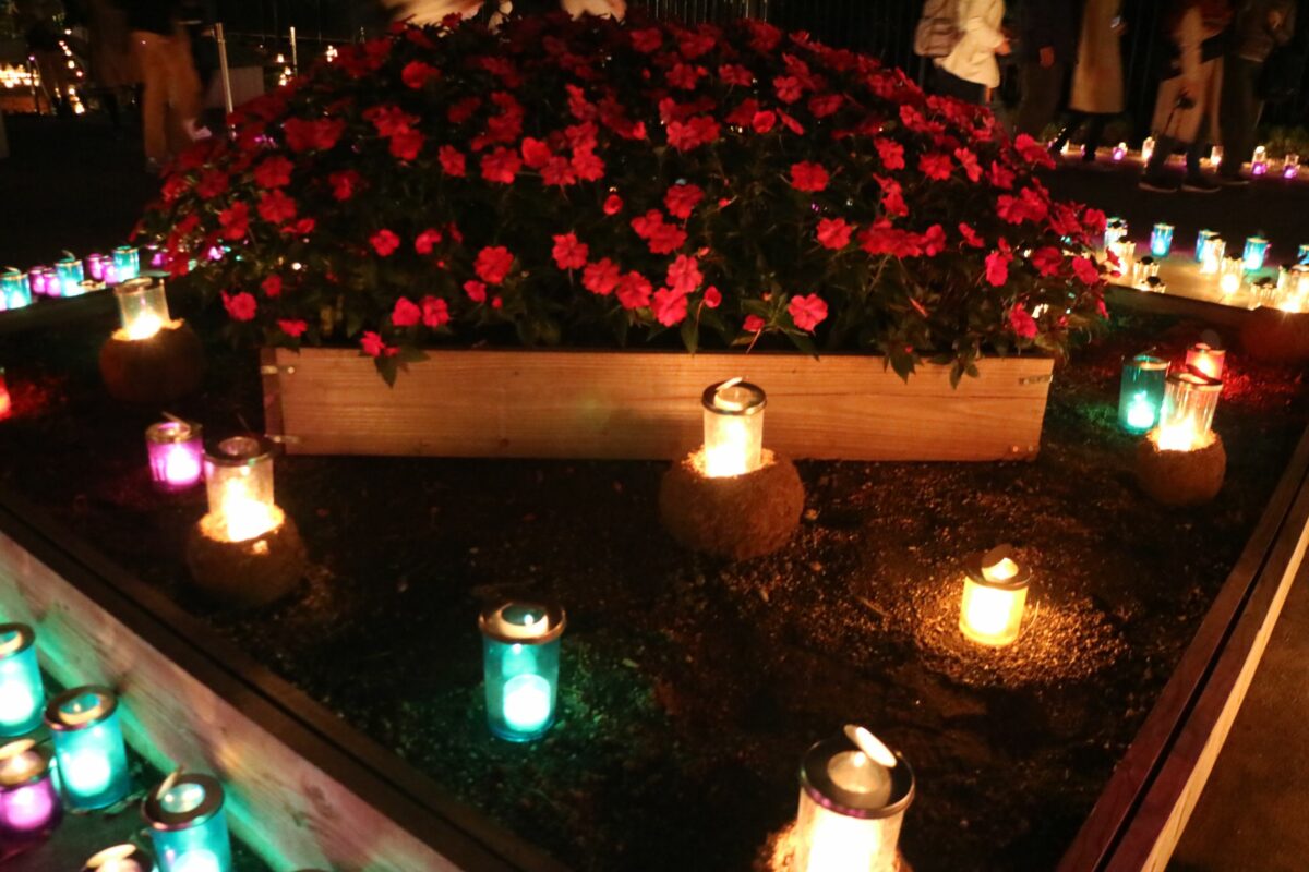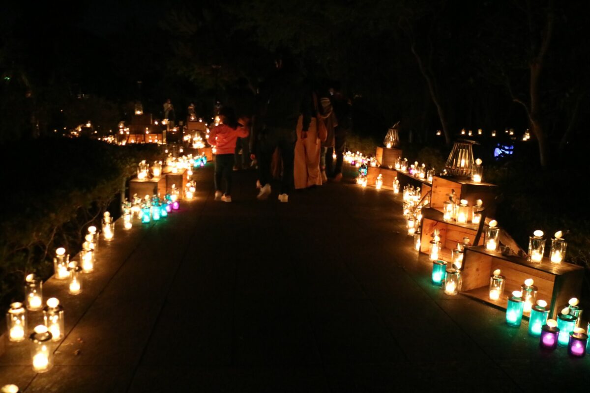 入口広場から展望灯台のシーキャンドルに向かう園路の左右には、キャンドルライトの光がまっすぐ延びていきます。
