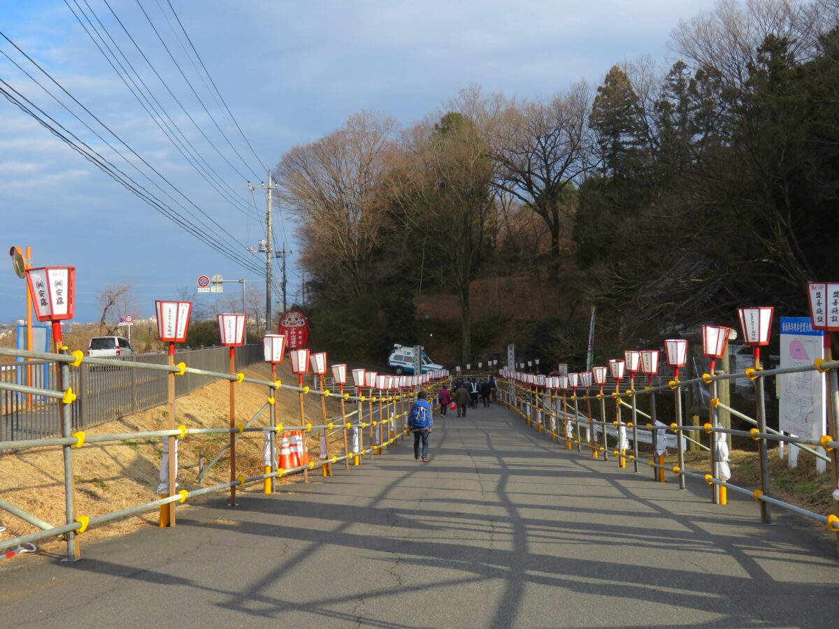 高崎市でだるま生産が盛んになったのは1780年代のことと伝わります。天明の飢饉のため苦しい生活をしていた農民に少林山達磨寺の第9代東嶽和尚が、張子のだるま作りを農民に勧め「少林山七草大祭」で販売するようになったのです。大祭の会場となる少林山達磨寺は、碓氷川沿いに建立されています。碓氷川の河川敷を走る少林山通り沿いの参道を進むと寺院の総門に突き当たります。門を潜ると百数十段の石段を上らなければなりません。