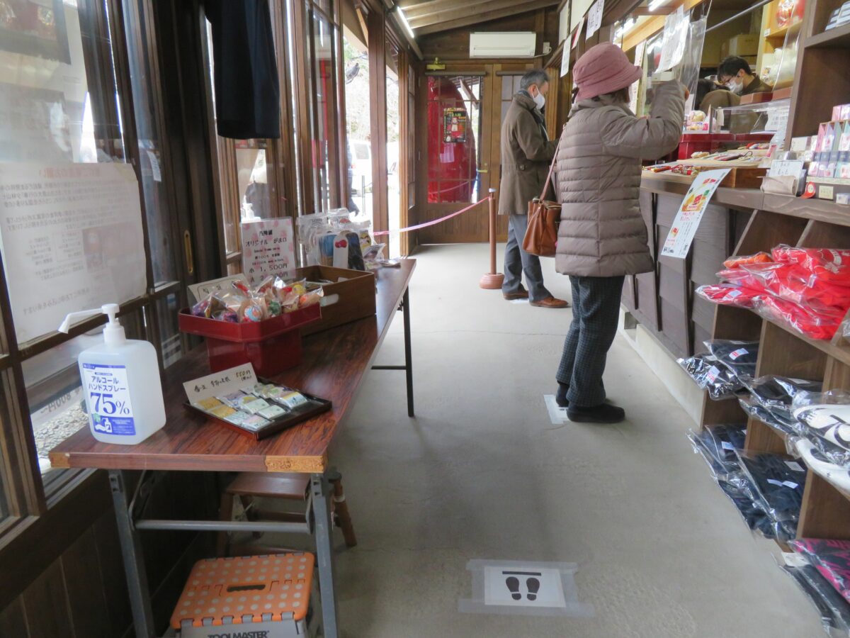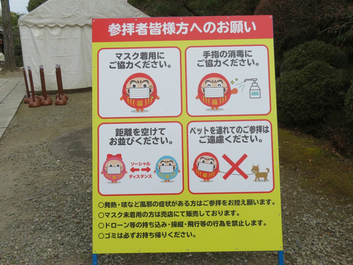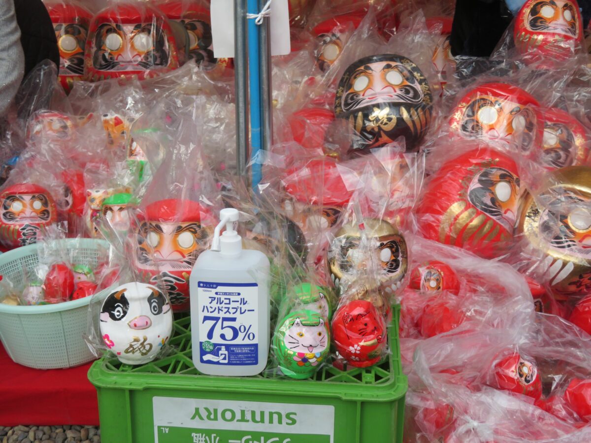 2021年の「少林山七草大祭だるま市」では、新型コロナウイルス感染防止のため例年、境内を囲む露店の姿はありませんでした。その代わりに随所に消毒スプレーが設置され、密防止のための掲示が行われていました。