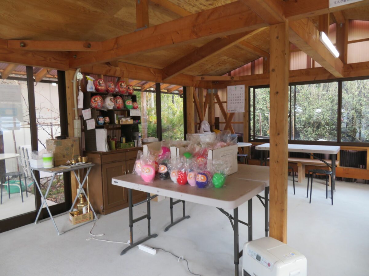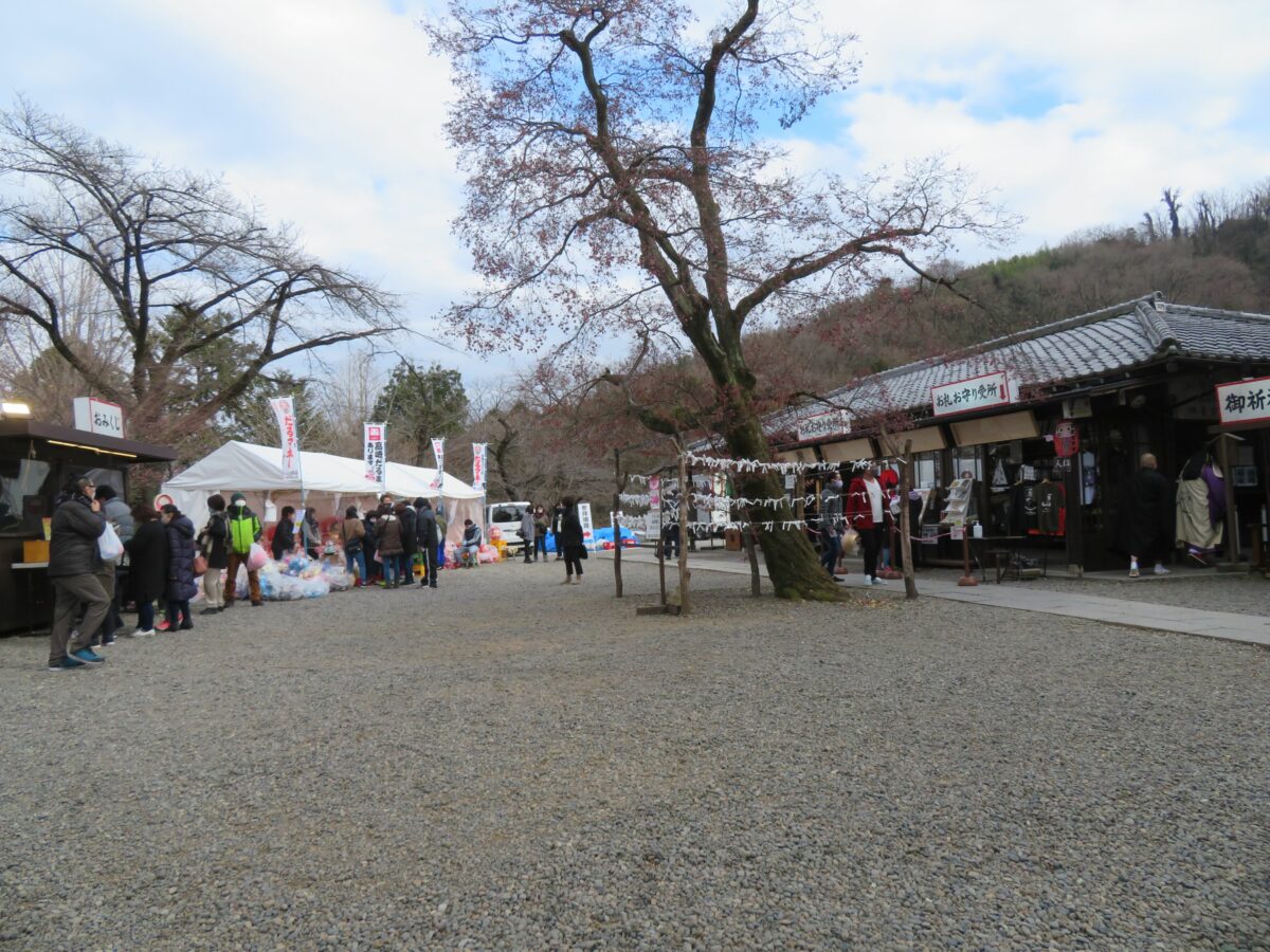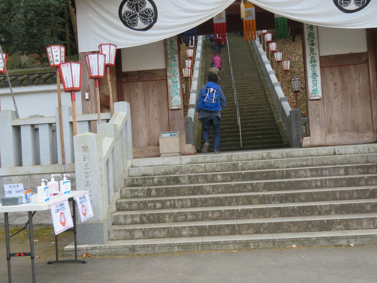 2021年の「少林山七草大祭だるま市」では、新型コロナウイルス感染防止のため例年、境内を囲む露店の姿はありませんでした。その代わりに随所に消毒スプレーが設置され、密防止のための掲示が行われていました。