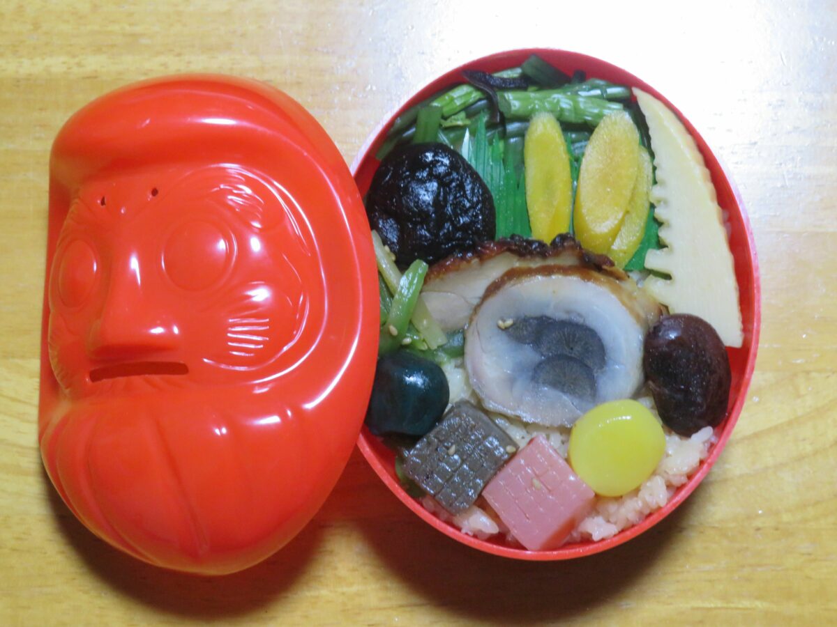 高崎市では豊岡地域を中心として、「高崎だるま」の生産の伝統が受け継がれています。日本で生産されるだるまの内、約80パーセントが高崎市で作られているのです。高崎の駅弁「だるま弁当」の箱はだるまの形をしています。茶飯風の炊き込みごはんに、筍、こんにゃく、栗、ごぼう、鶏肉などの群馬県産の農畜産物が載せられています。日本の吉祥である鶴を眉毛、亀を口髭に描く「高崎だるま」は、「福だるま」、「縁起だるま」と呼ばれることもあります。