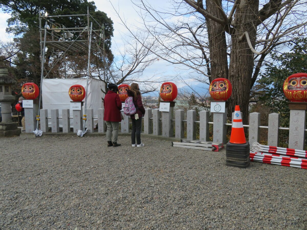 石段を上りきると正面に見える権現造りの霊符堂では、達磨大師を祀っています。霊符堂の東側には「古いだるまお札納め所」が設けられ、堂内では新しい年のだるまに目を入れ、「開眼」の儀式を行いながら魂を入れてくれます。