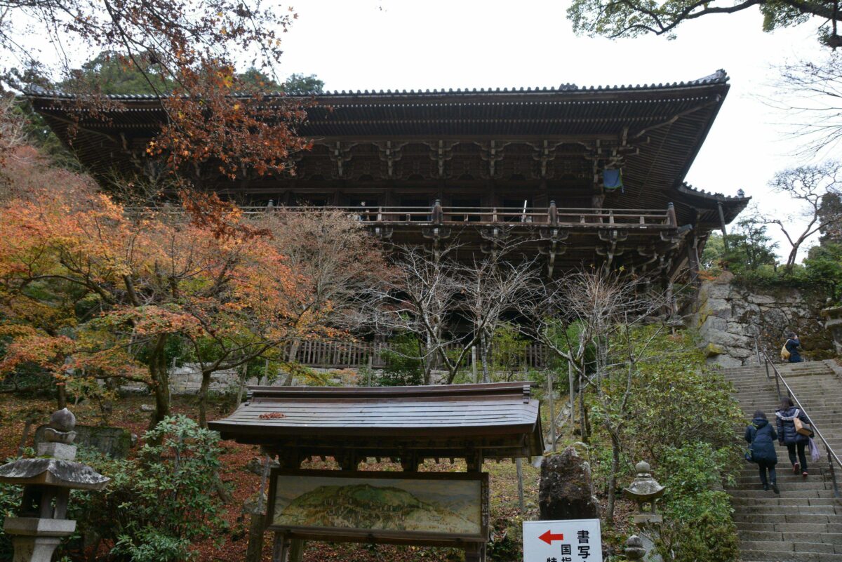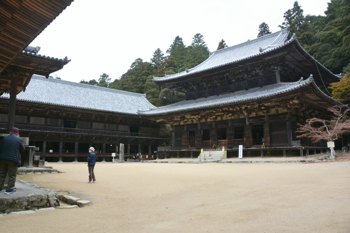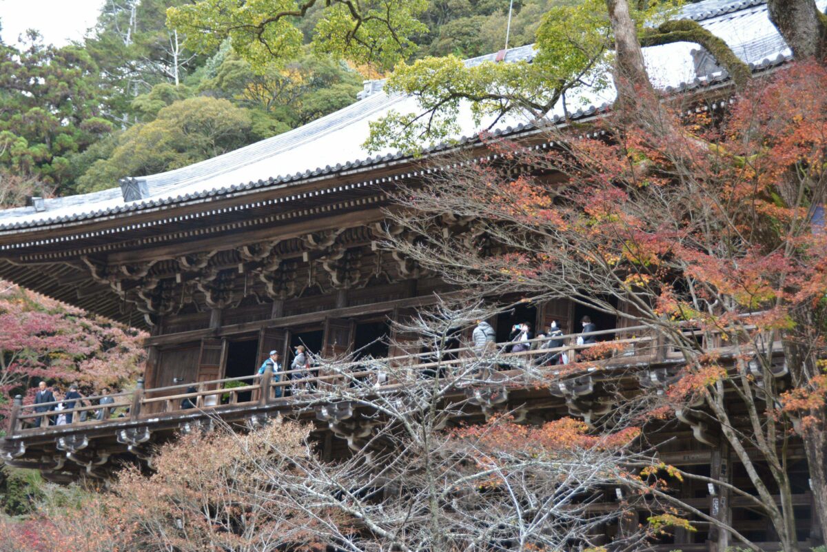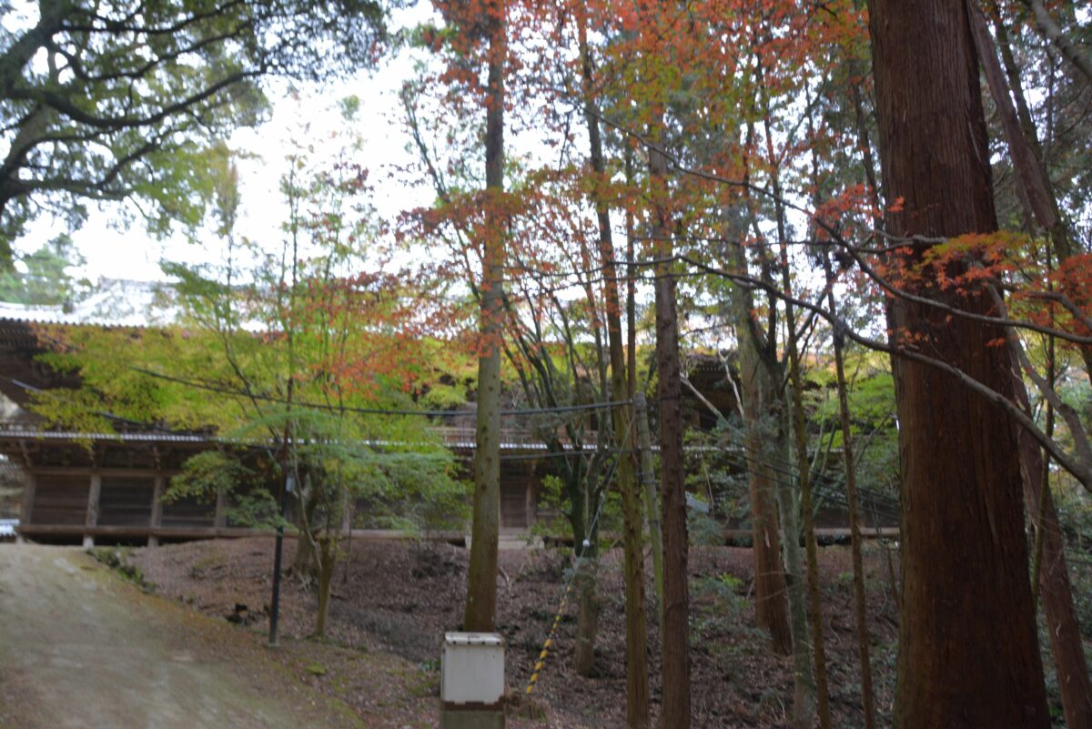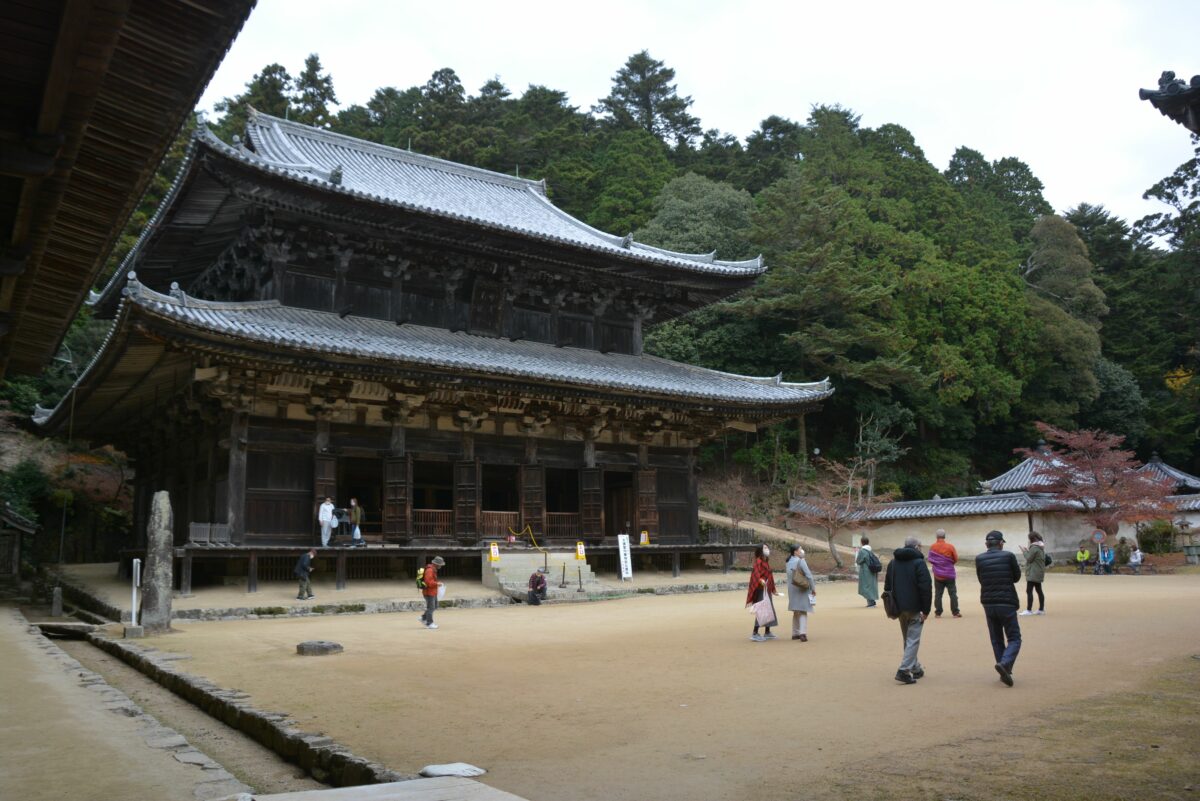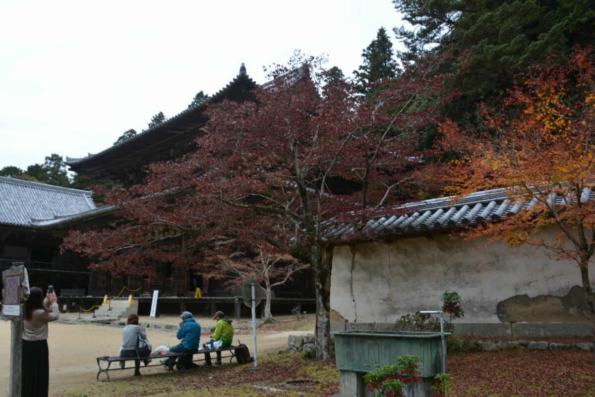 摩尼殿から紅葉で彩られる山道を西に向かうと、堂々とした3つの建築物がコの字の空間に出ます。「三之堂」と呼ばれる特徴的な空間は、映画『ラストサムライ』をはじめ、『軍師官兵衛』など数多くのNHK大河ドラマのロケ地となりました。