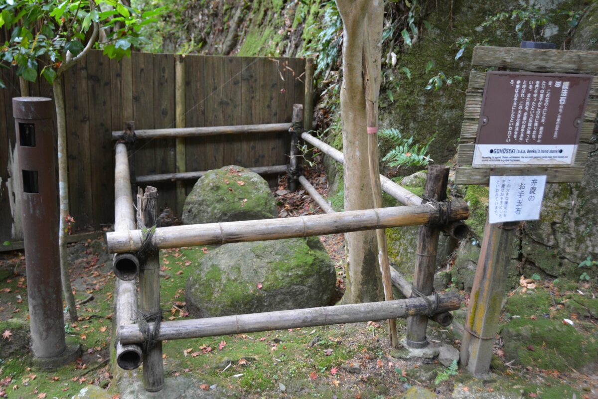 摩尼殿の下には、丸みのある大きな石が横たわっています。弁慶のお手玉石と呼ばれる石は、弁慶がお手玉代わりに投げたと伝わります。また、摩尼殿の傍らの広場では、猿回しのイベントが演じられることもあります。