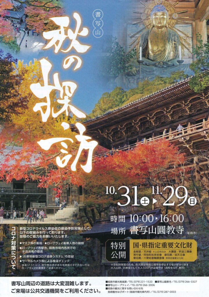 平安時代の後期に京都の五条大橋で源義経と出会った弁慶は、生涯を義経に捧げたと伝わります。弁慶には数多くの伝説が残り、幼少期には兵庫県姫路市の書写山の圓教寺で修業を積んだとされています。姫路市の北西部に標高約370メートルの書写山が聳え、山肌は例年10月下旬から11月下旬にかけて紅葉で覆われ、「書写山・秋の探訪」が開催されています。2020年は10月31日~11月29日に行われました。「書写山・秋の探訪」の期間中には普段は公開されていない国・県指定の重要文化財が特別公開されます。