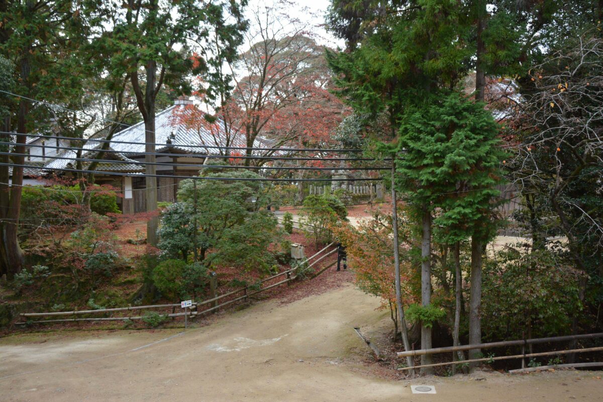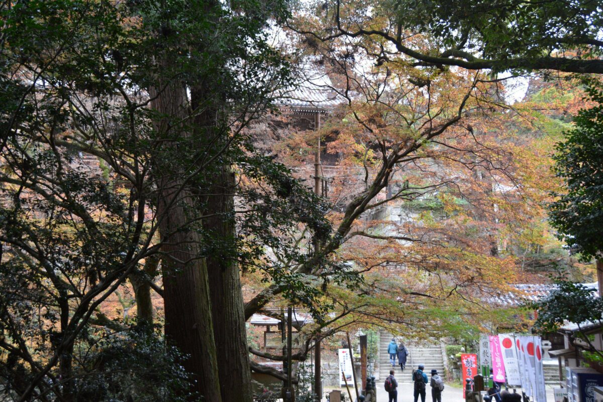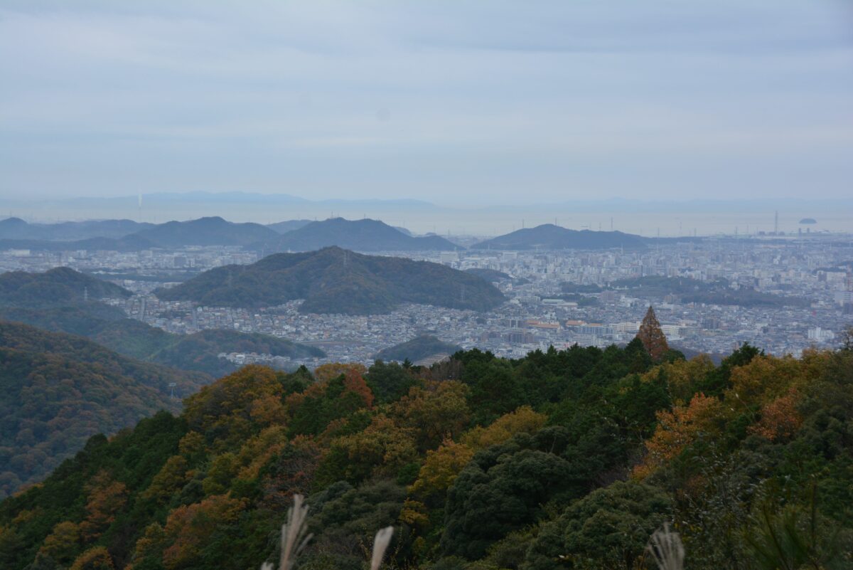 圓教寺の境内では、堂々とした仏閣を彩る紅葉を楽しむことができますが、山中に設けられた展望台からは山肌の紅葉越しに姫路の市街地、瀬戸内海の海原を見ることができます。