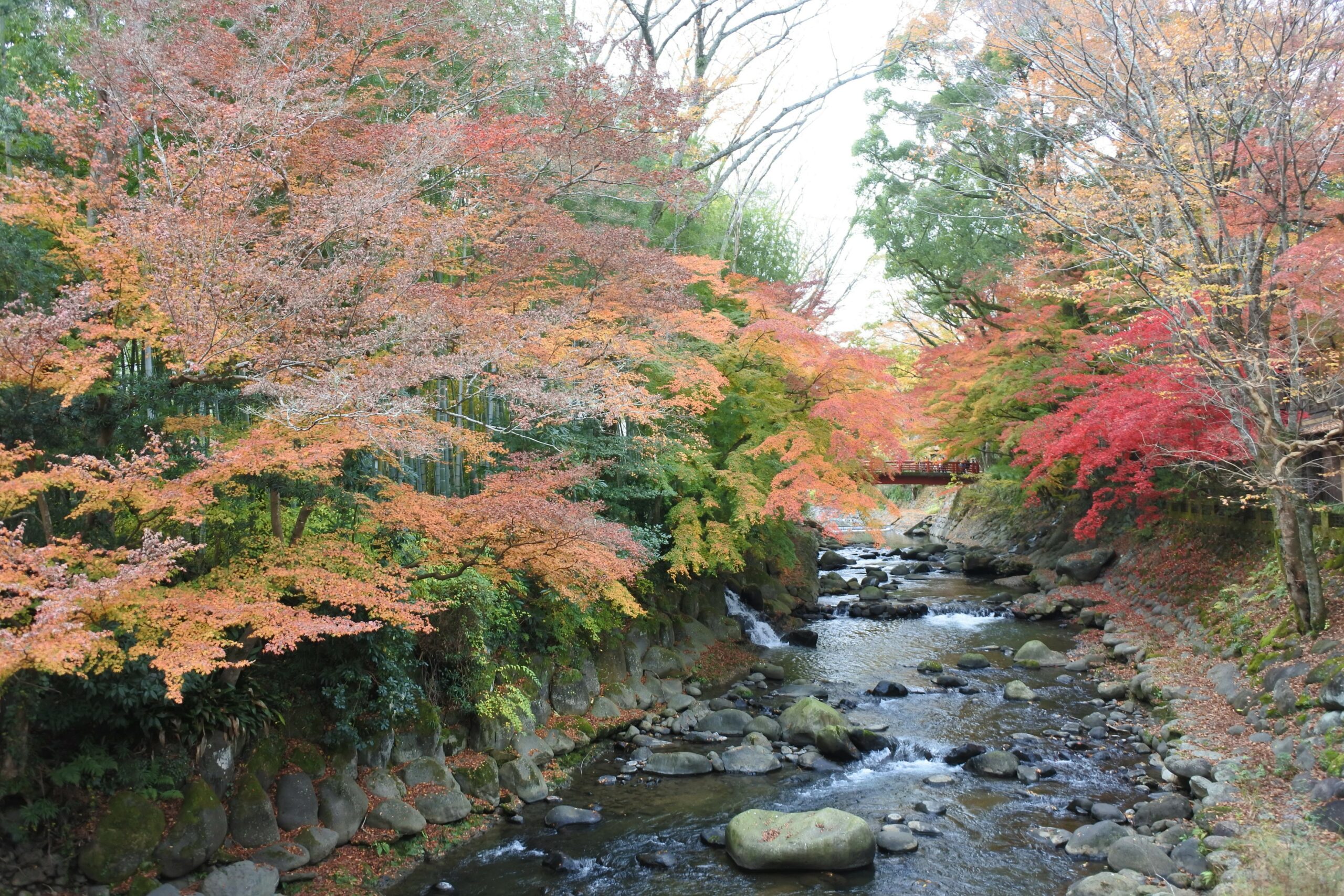 赤い橋と紅葉、そして川の流れが美しい、人気スポットの1つ。