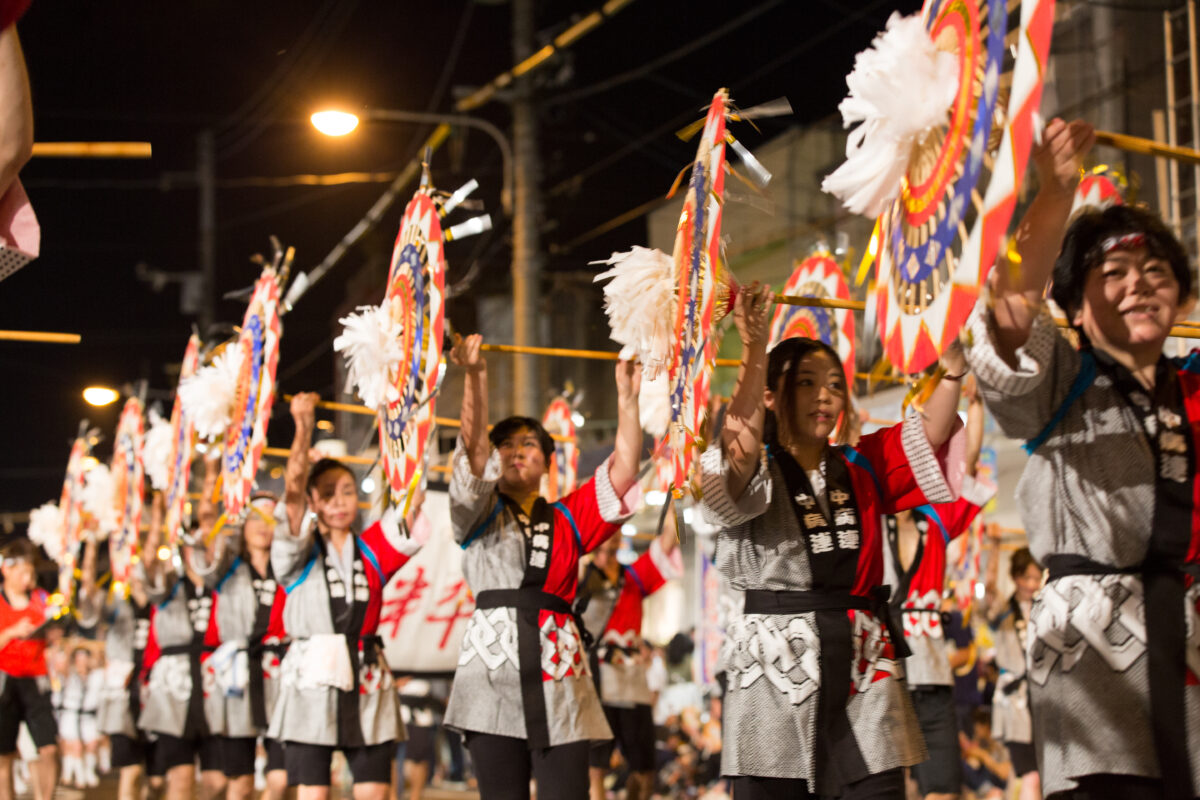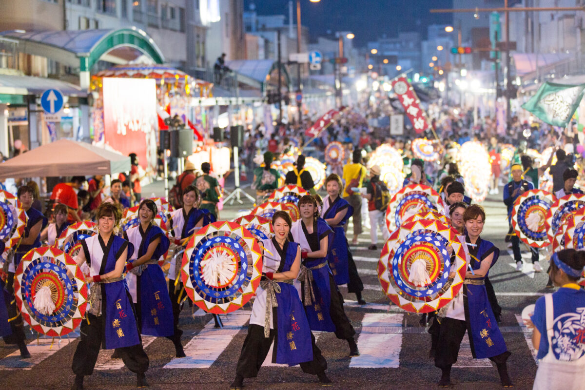メインイベントである「しゃんしゃん一斉傘踊り」では約4000人が傘を手に華麗な群舞を繰り広げ、夜は花火大会も行われます。