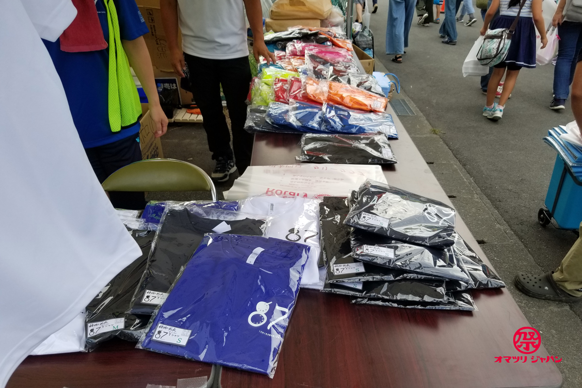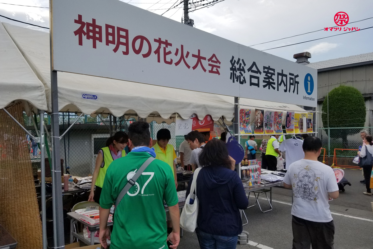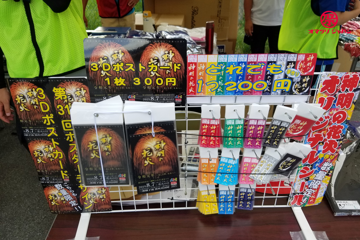 今年も相変わらず観覧会場の手前にある市川大門グラウンドは屋台が盛況で、花火が始まる前から大賑わいでした。入口の神明の花火大会 総合案内所では花火グッズが並び、令和元年限定デザインのタオルは既に完売状態。Tシャツやポロシャツも以前よりも種類が増えていました!