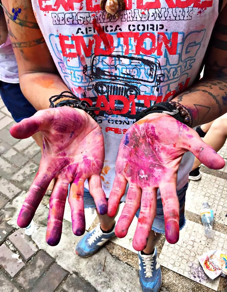 シヌログといえば、顔も体もペンキを付け合う様子が有名。街を歩けば、秒殺でペンキまみれです。