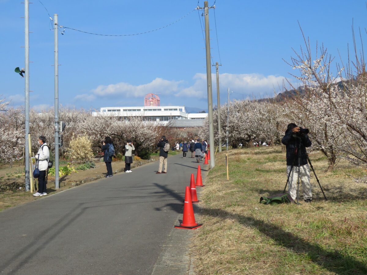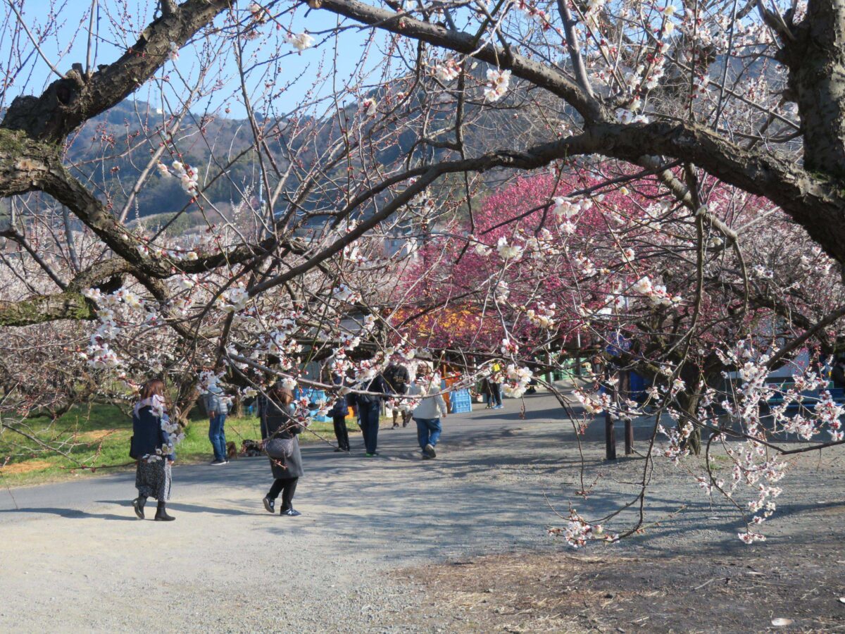 曽我別所梅林では、梅の花を眺めながら東西、南北に数百メートルの園路を歩くことができますが、最大の魅力は梅林の西方に富士山が聳えていることでしょう。山頂に雪を被る富士山を背景に、梅の可憐な花を見ることができるのです。