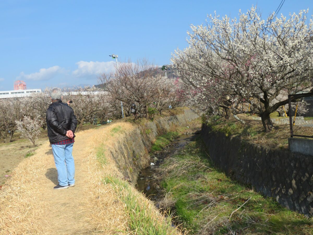 案内板の矢印に従って下曽我の町中を歩き、剣沢川に架かる小橋を渡ると梅林の中心です。