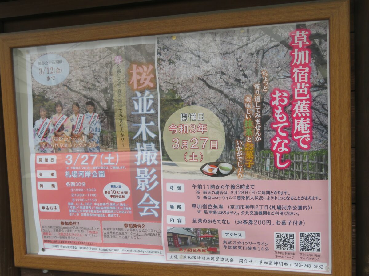 草加市で最も規模の大きな桜並木は葛西用水の両岸に繋がりますが、稲荷橋から西に約1.5キロの札場河岸公園も桜の名所スポットです。公園沿いの綾瀬川と伝右川にも桜が並木を作っています。「草加さくらまつり」の開催期間中には「桜並木撮影会」が行われ、2021年には3月27日に実施されます。