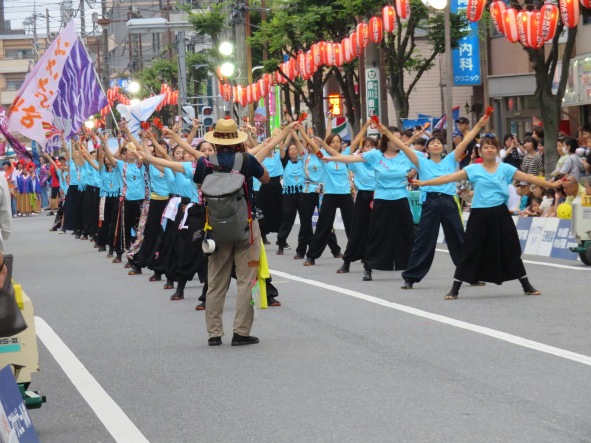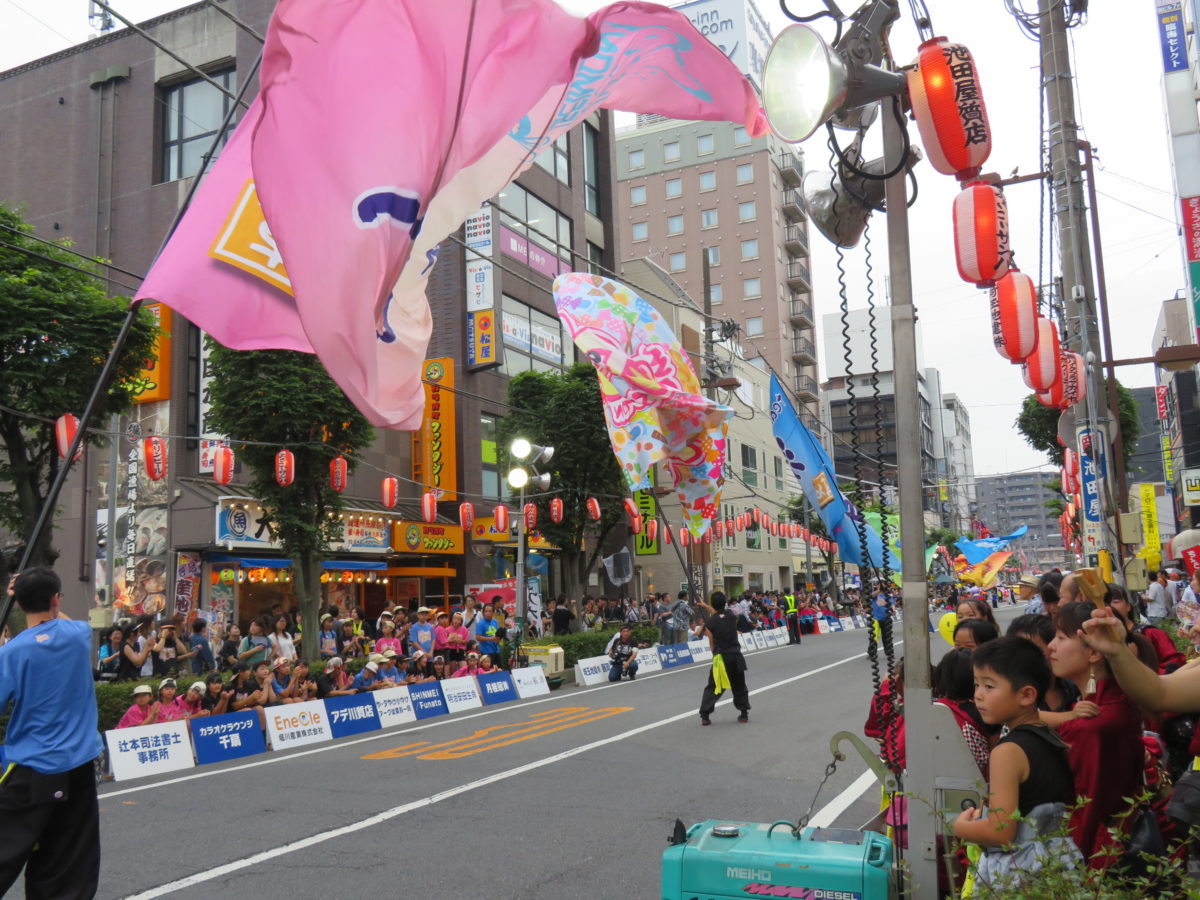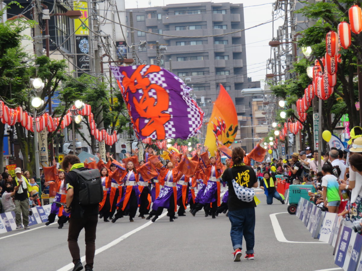 「草加よさこいサンバフェスティバル」の開始を告げるのは、駅前通りでの「大旗の競演」です。フェスティバルに参加する連の大旗が、一列に並び大きく降られます。静かだった空間にいきなりエネルギーが注入され、期待感が膨らみます。「大旗の競演」の後、数分刻みで途切れることなく、いくつもの連が「よさこい」の流し踊りを披露します。