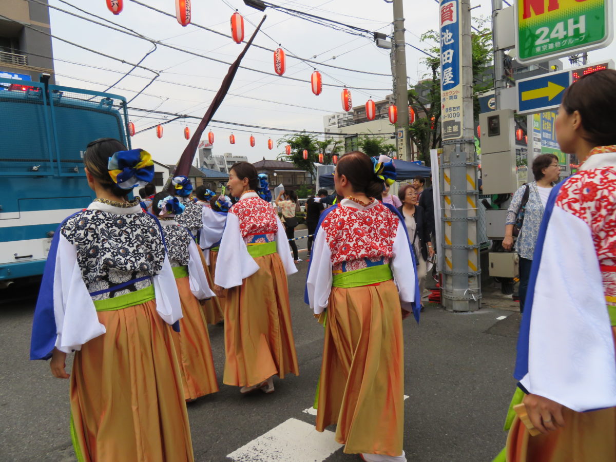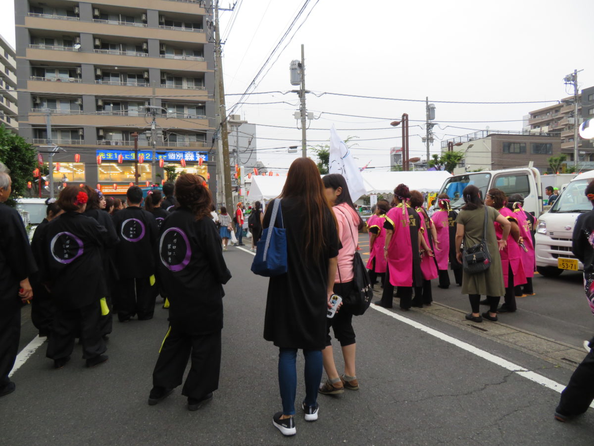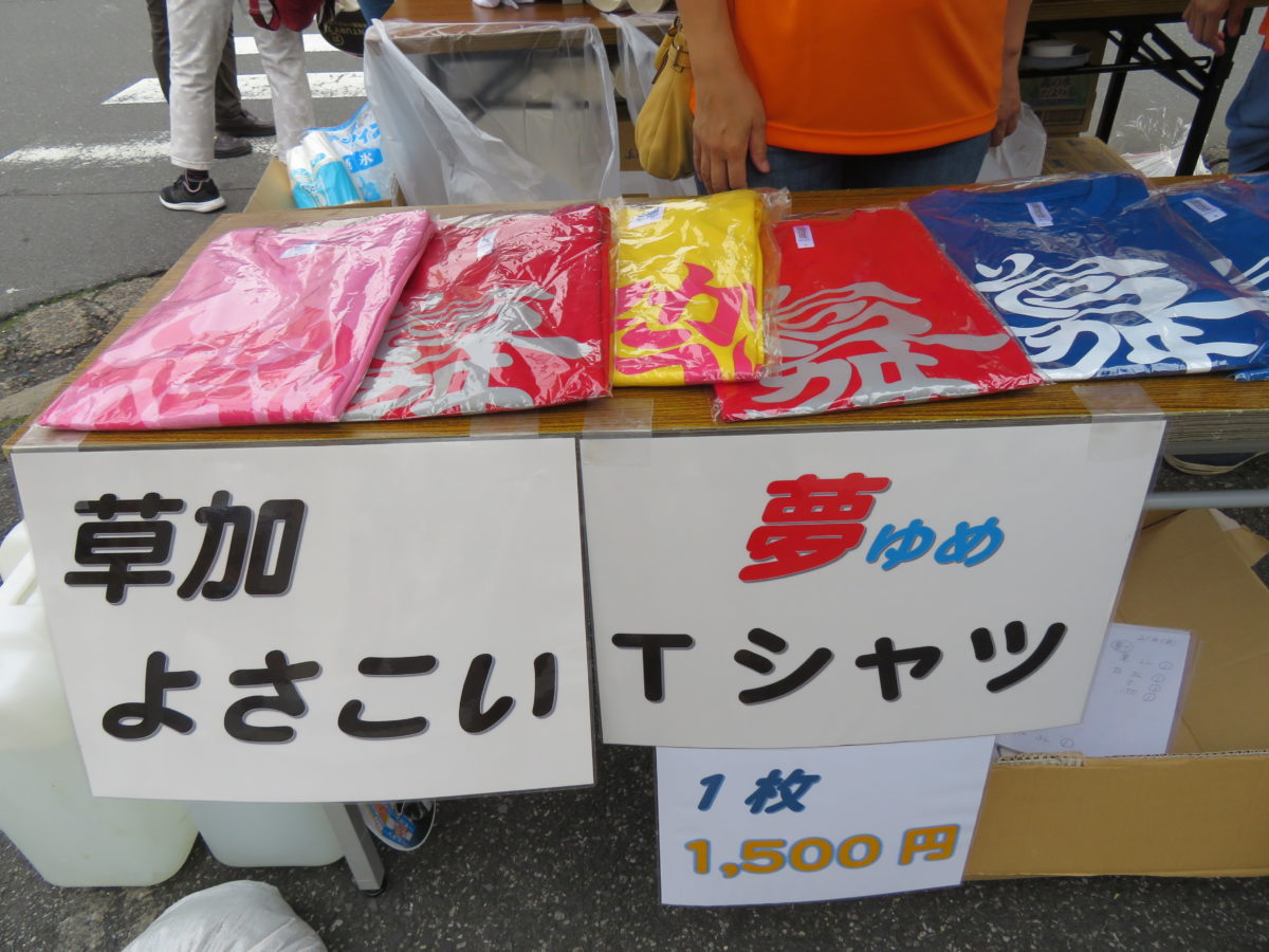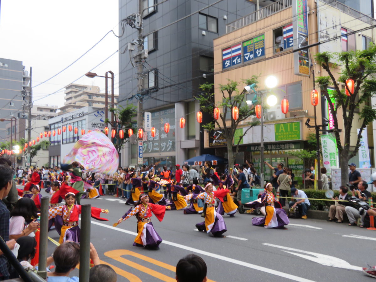 「草加よさこいサンバフェスティバル」の開始を告げるのは、駅前通りでの「大旗の競演」です。フェスティバルに参加する連の大旗が、一列に並び大きく降られます。静かだった空間にいきなりエネルギーが注入され、期待感が膨らみます。「大旗の競演」の後、数分刻みで途切れることなく、いくつもの連が「よさこい」の流し踊りを披露します。