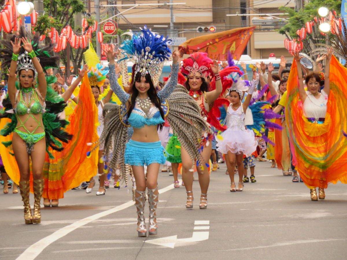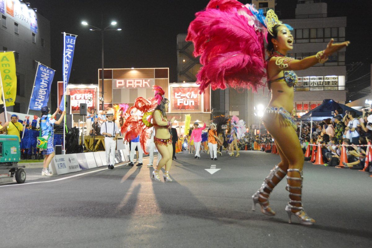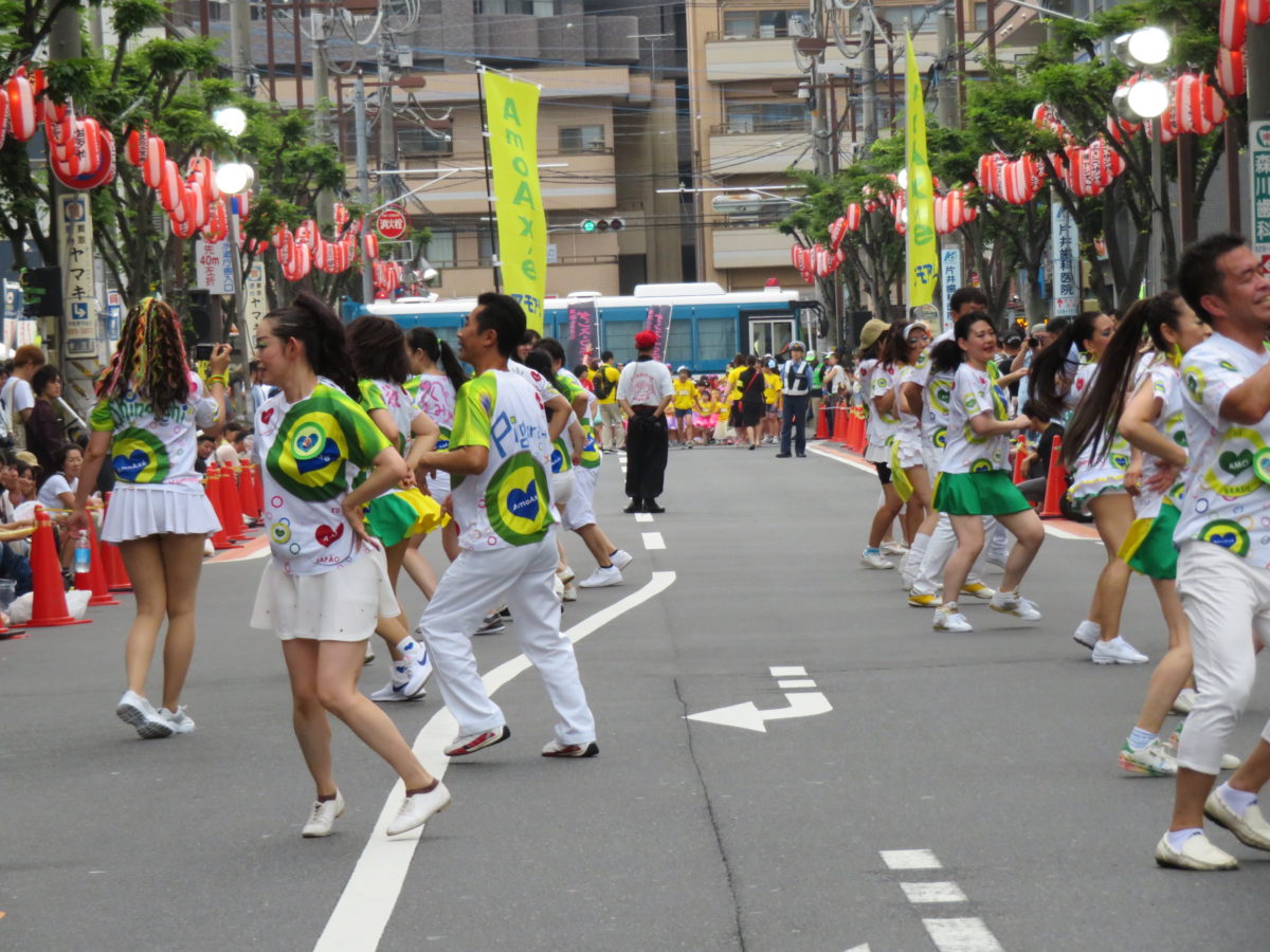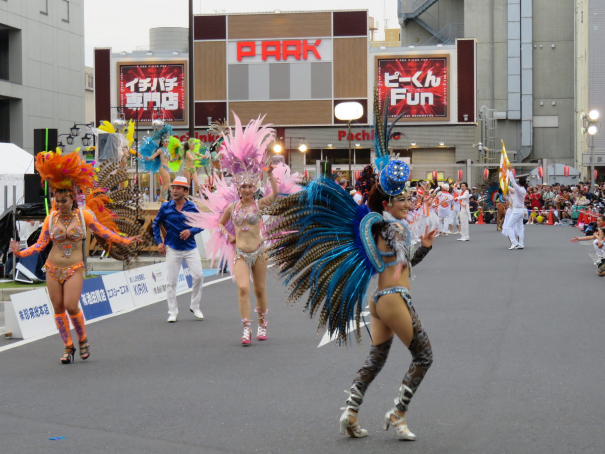 「よさこい」の流し踊りの合間には、「サンバ」チームの流し踊りが行われます。「サンバ」は19世紀末にブラジル北東部の港町、サルバドールで発祥したと言われています。楽器も音楽もダンサーのコスチュームも、「よさこい」とは大きく異なります。日本と南米の表現スタイルの違いを肌で感じることができます。プログラムが総合案内所に置いてありますから、それを参考に観覧場所を決めるのがいいでしょう。