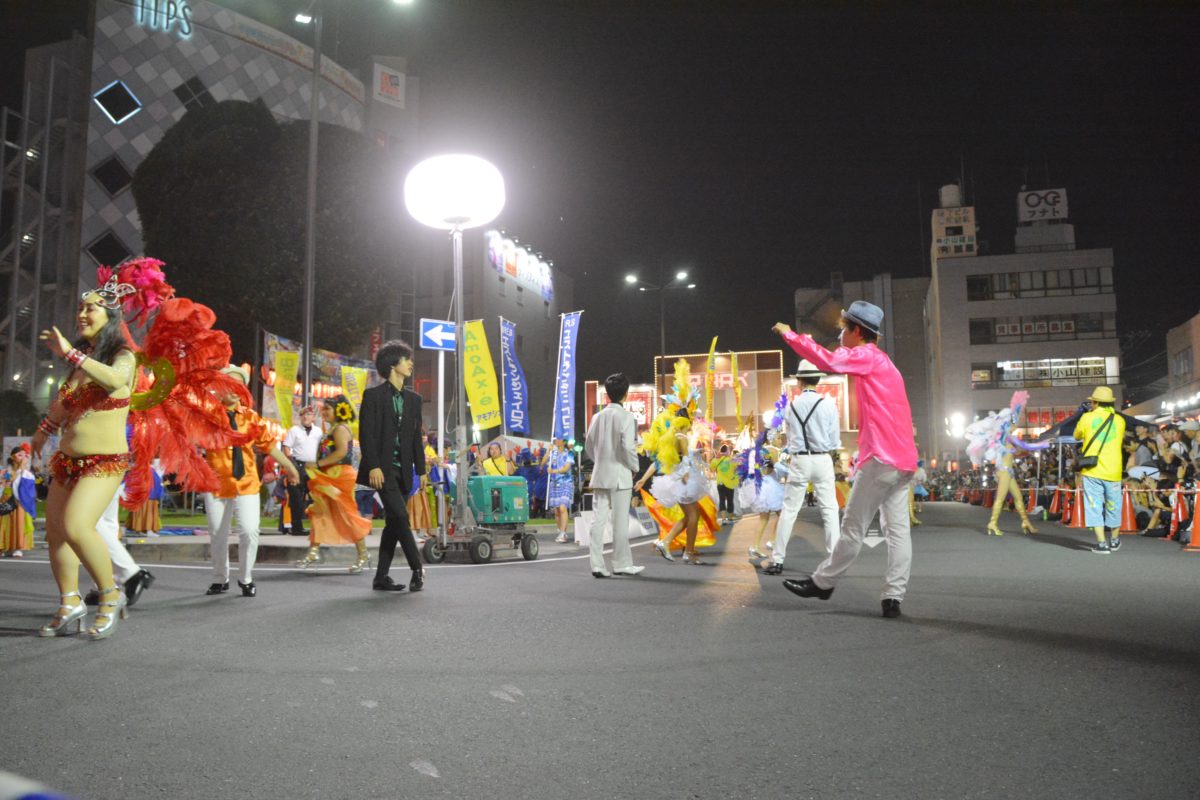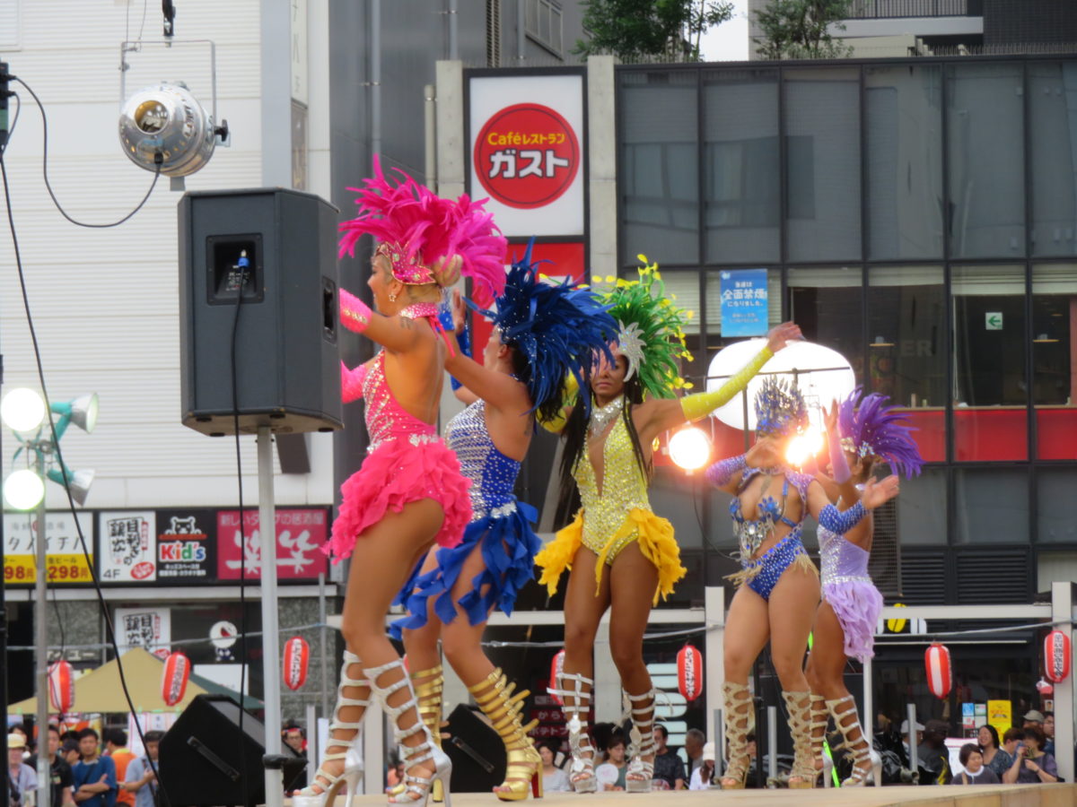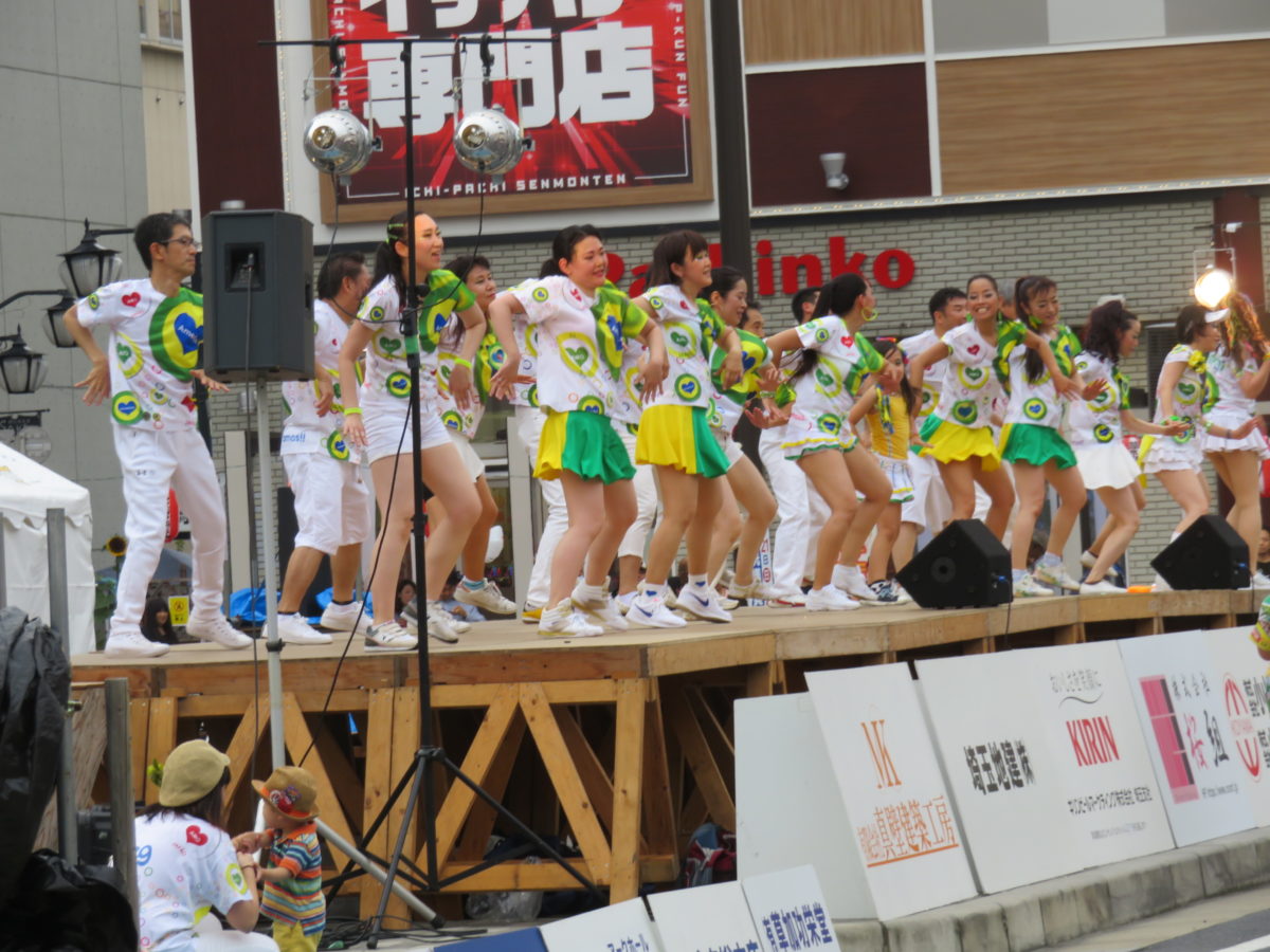 駅前通りで流し踊りが行われている同じタイミングで、西口ロータリーでも、「よさこい」と「サンバ」の演舞が順番に行われます。前後左右に広がる空間を利用したパーフォーマンスに躍動感を感じます。
