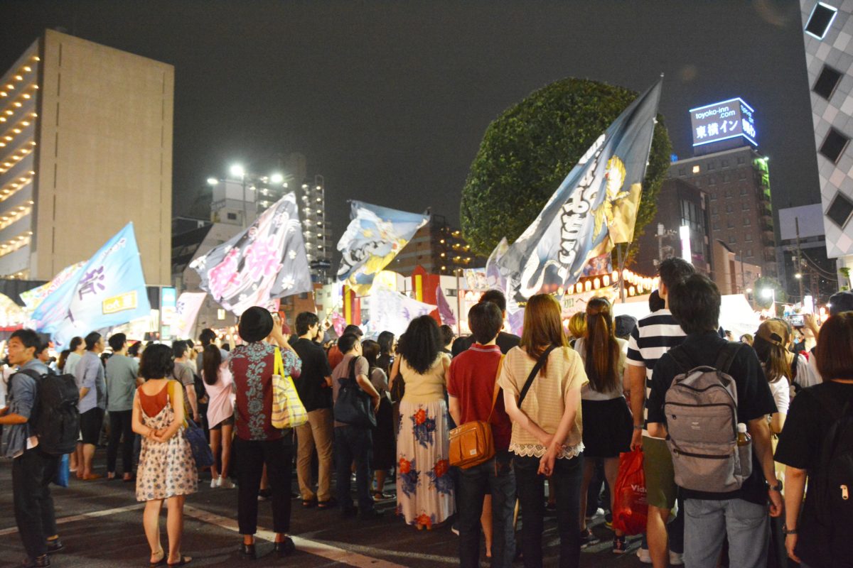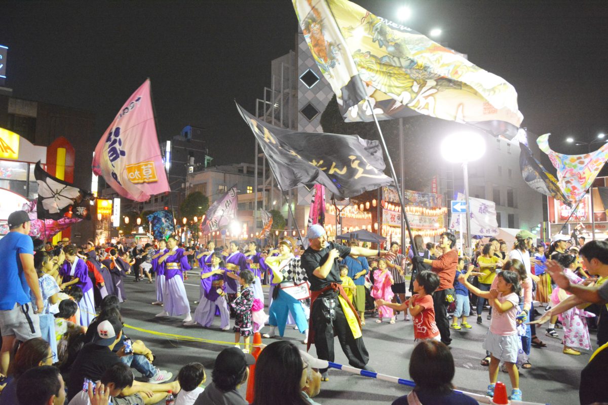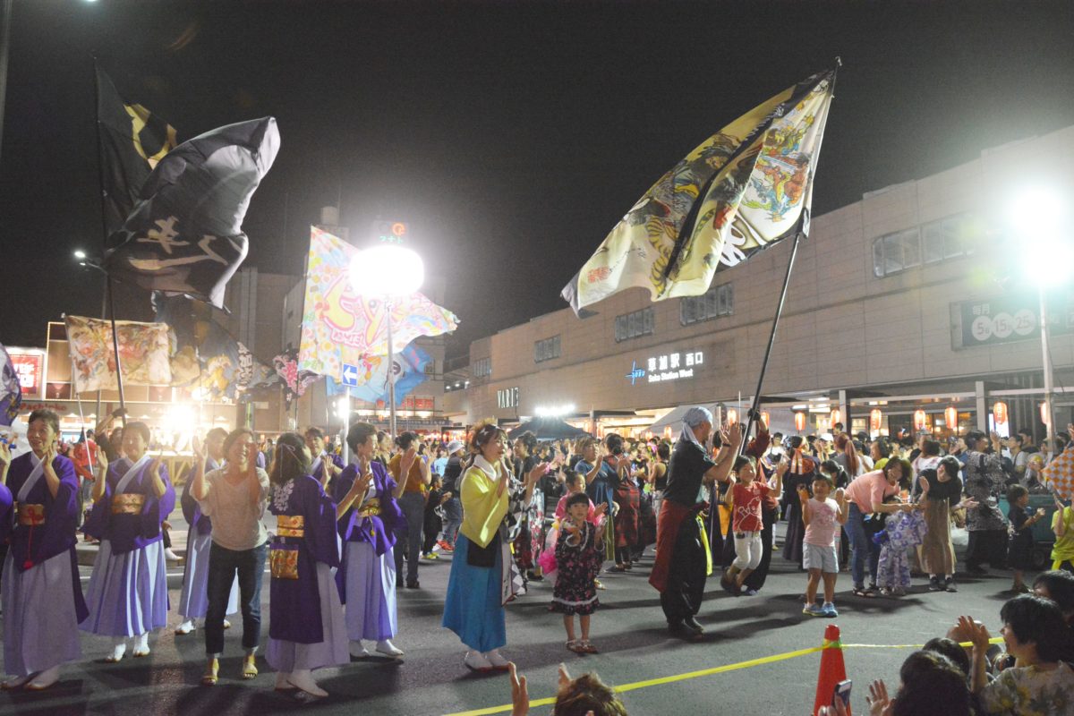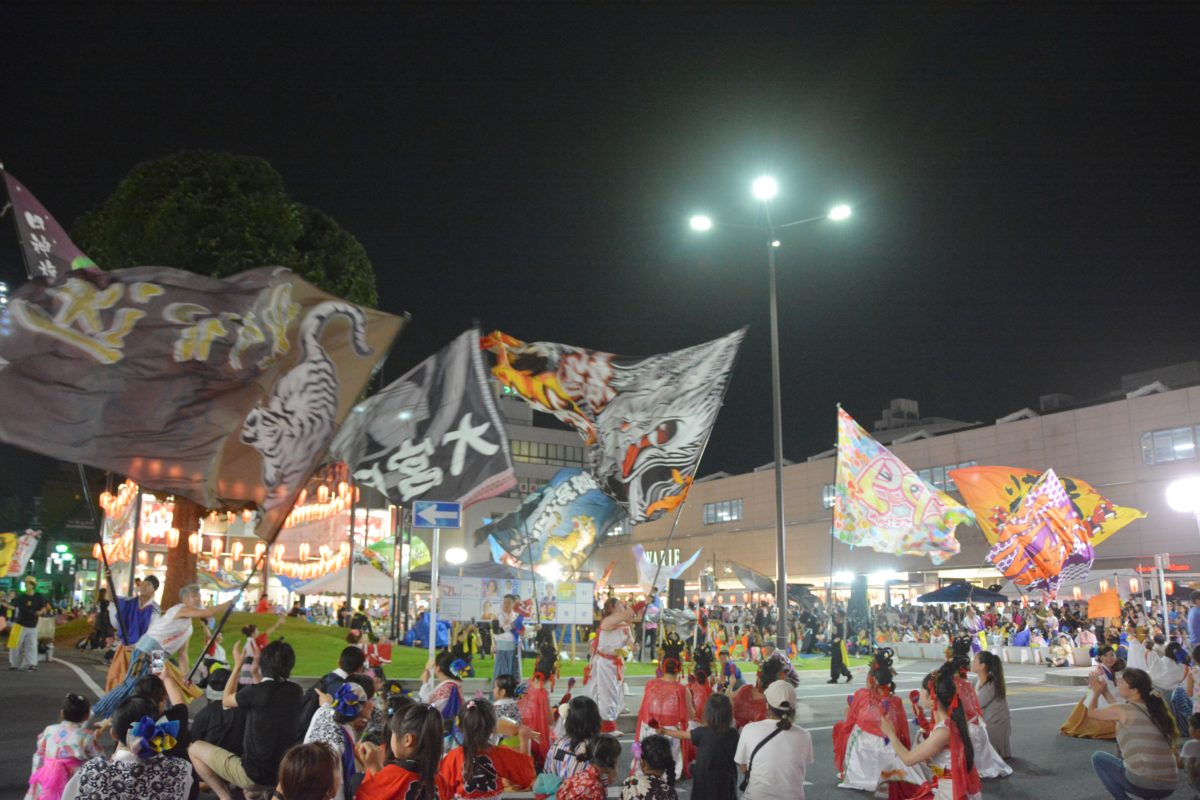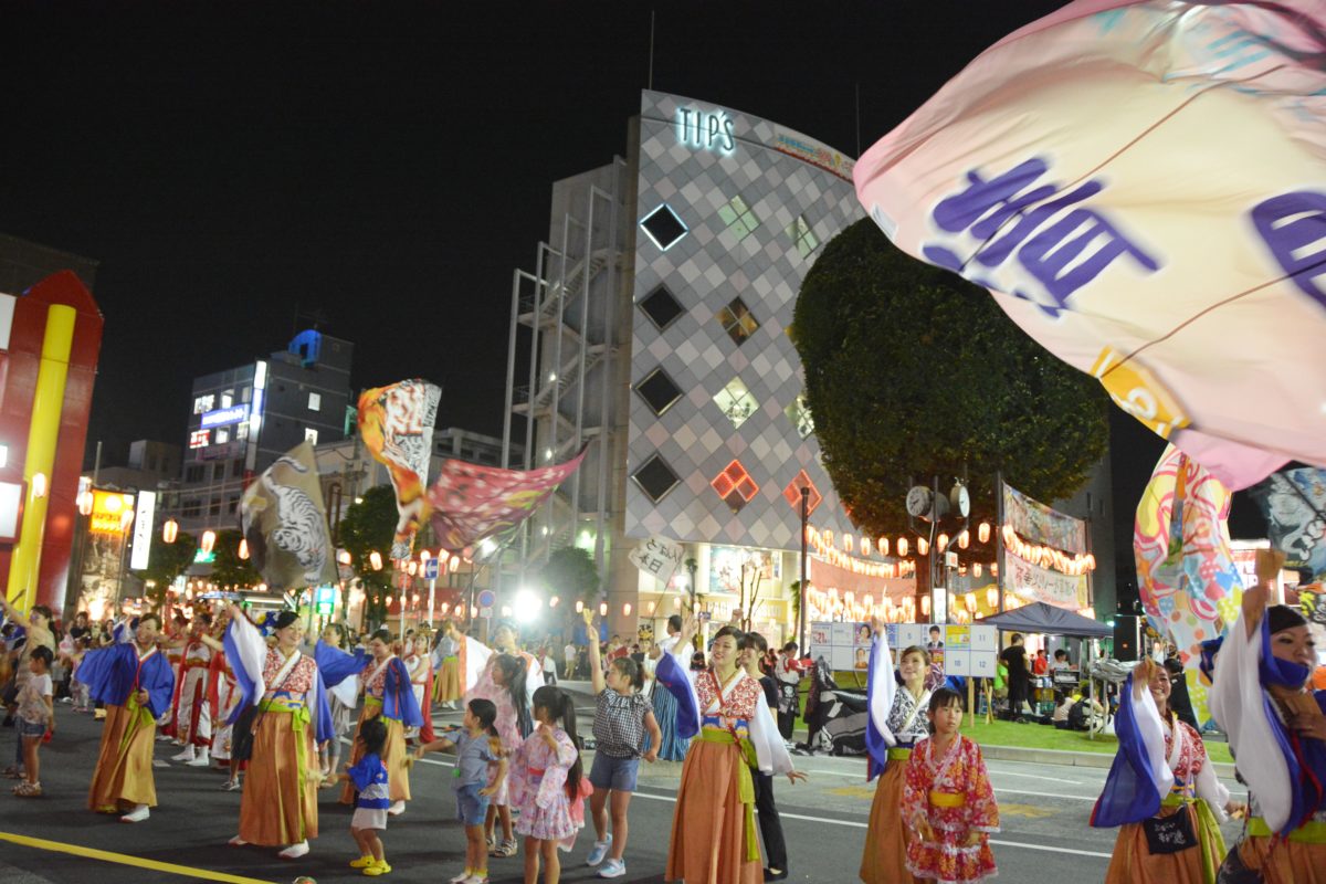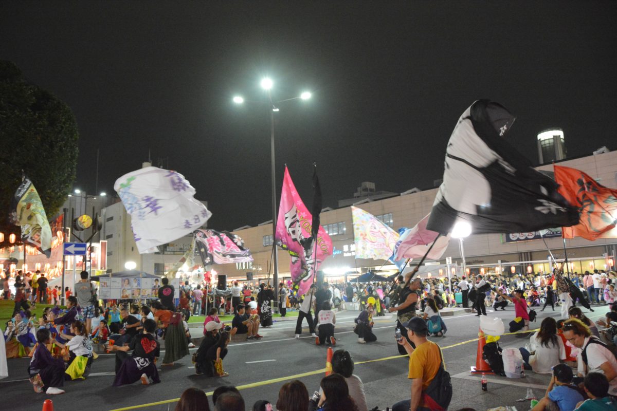 フェスティバルのクライマックスは、2日目のフィナーレです。19:45前後から参加団体が西口ロータリーに勢揃いし、「サンバフィナーレ」を皮切りに、「よさこいフィナーレ」が続き、「総踊り」へとなだれ込みます。観客も自由に踊りの輪に加わることができるので、会場は興奮に包まれます。そして、「大旗の競演」でフェスティバルの幕が下ろされます。
