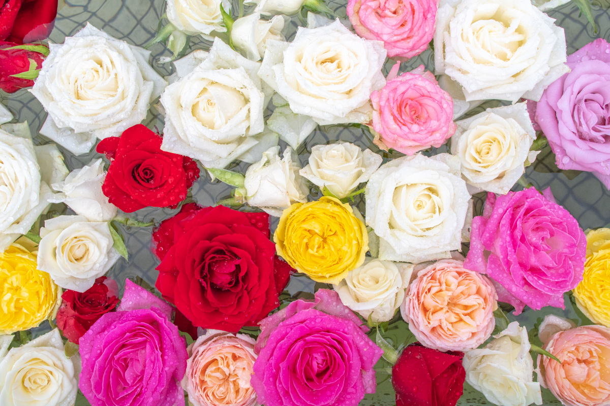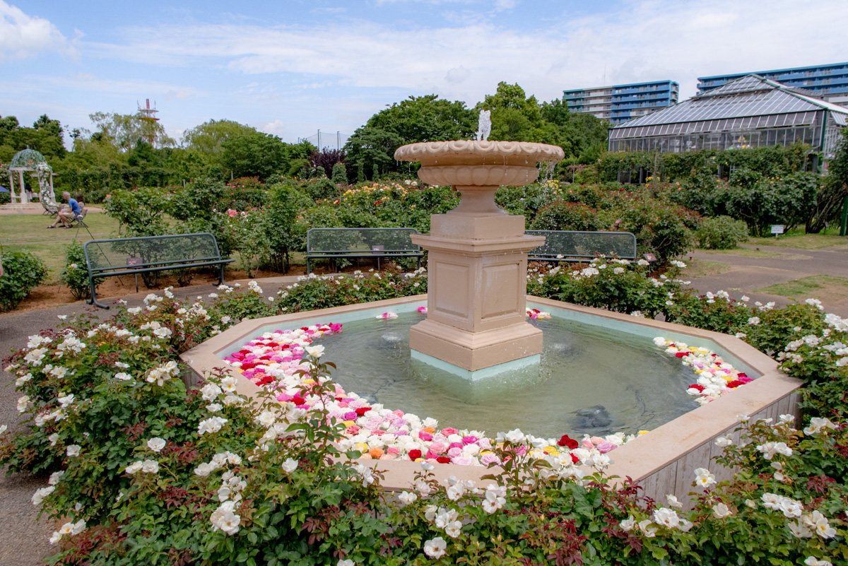 温室を出てすぐの噴水・エデンの泉では、6月12日・恋人の日に合わせて「フラーティングフラワー」が行われていました。京成バラ園ならではの無数の生バラが、水をはじきながら艶やかに浮かびます。この日は快晴ということもあって青空との組み合わせもバッチリでした。