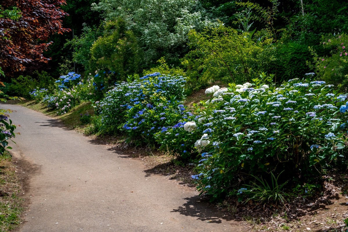 アジサイが楽しめるのは園内の最奥部にある自然風庭園の中。バラ園から樹齢70年の木のアーチをくぐり向かいます。