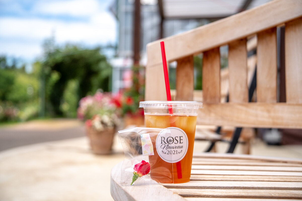 また大温室の前には特設ドリンクカウンターが設置されており、広大なバラ園を眺めながら一休みが可能です。いただいたのはローズアイスティー。しっかりとした紅茶の味に甘酸っぱいバラの香りが鼻に抜け、この日の気候にピッタリでした。ドリンクと一緒に渡されるエディブルフラワーを浮かべると、味と香りだけでなく視覚からもバラの魅力が楽しめます。