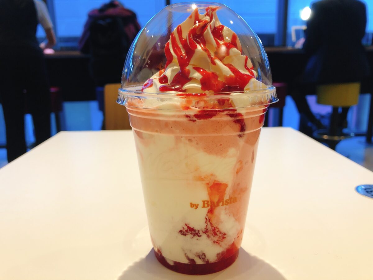 まずはフラッペから!砕いた氷とミルクを注文してから混ぜ合わせてつくる新鮮なフラッペは、シェイクのように、ガツンとした甘味ではなく上品なカフェの味。大人もMサイズをたっぷり最後まで楽しめそうな優しい甘味です。