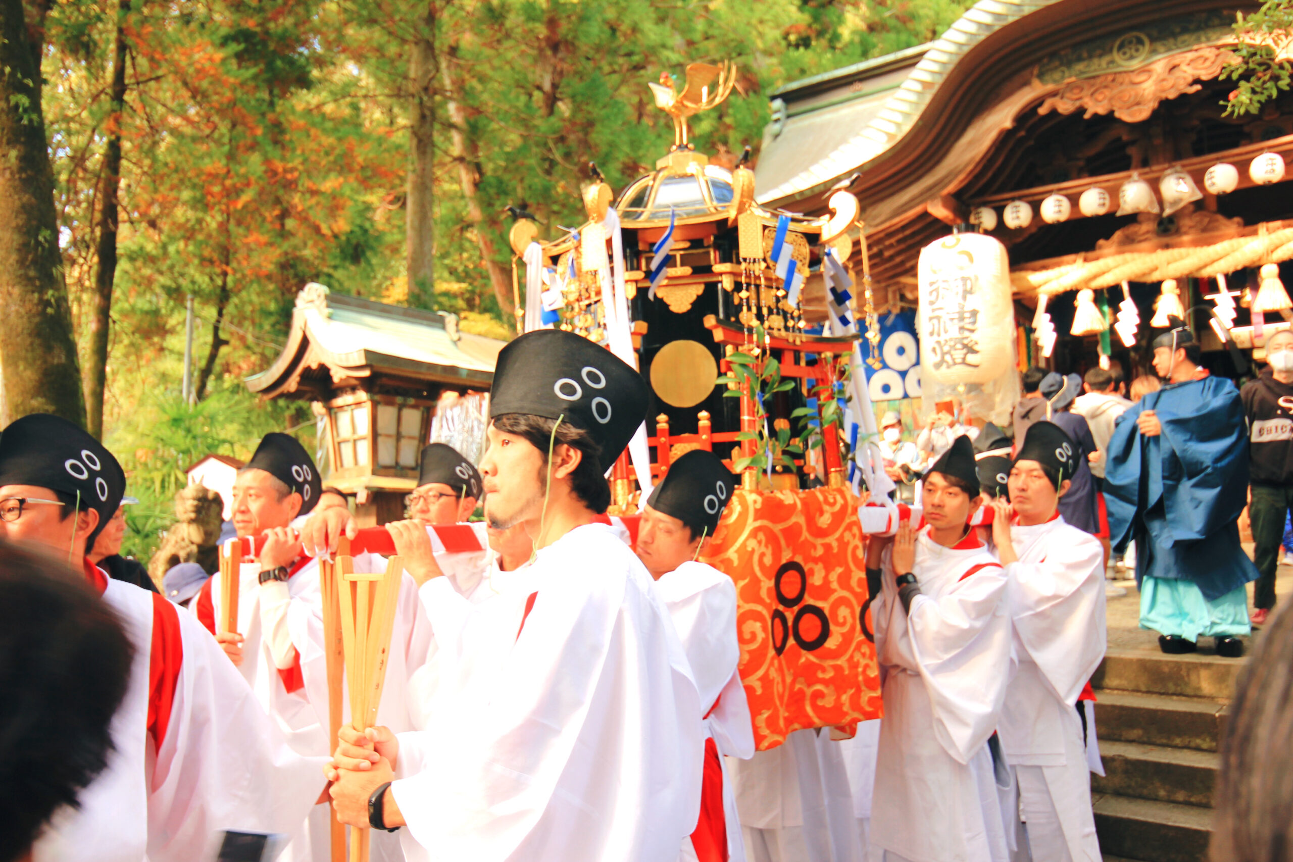 列の最後は、神様をのせたお神輿です。お神輿は、鎌倉時代に奉献された記録がのこっていて、お神輿の上の鳳凰(ほうおう)は、国の重要文化財にも指定されているそうです。