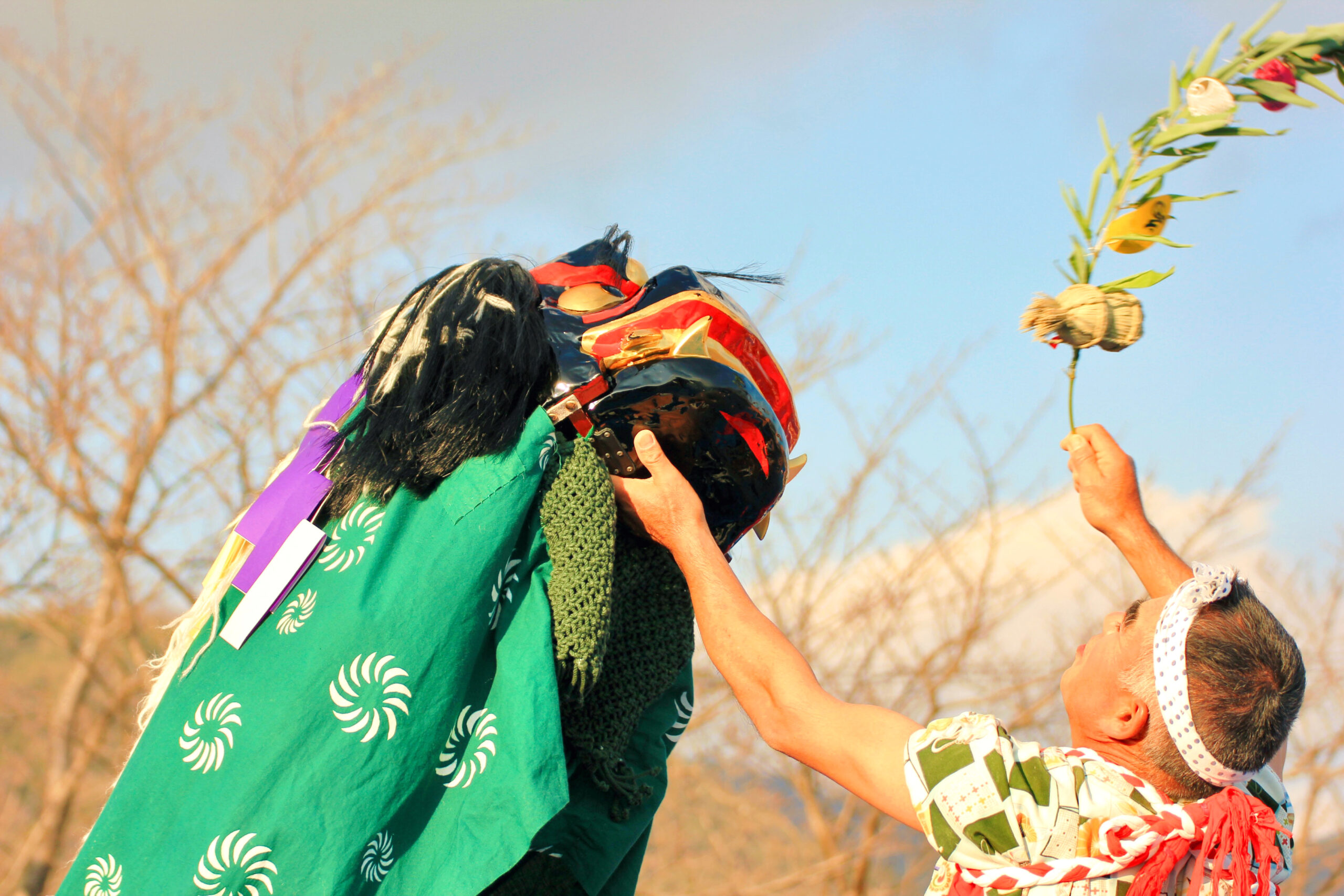 その後は、地元のおばあちゃんが、なぜかコッソリと耳打ちで教えてくれた榊(さかき)合戦なるものがありました。老若男女関係なく「よーい、どん!」で、榊を取り合うというワイルドな合戦です。この榊には、ご利益があるそうで、持ち帰って大切にお家に飾るのだと教えていただきました。