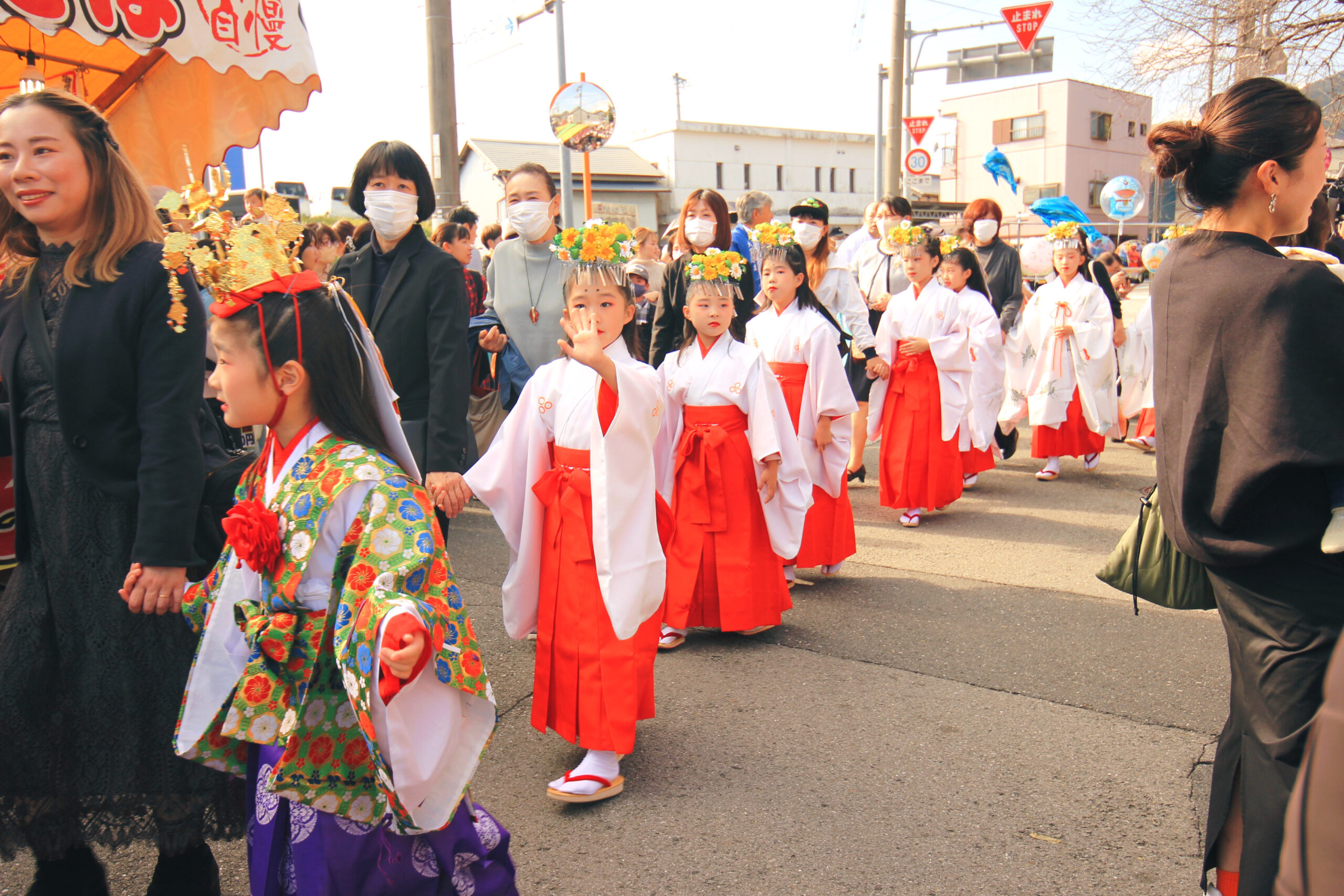 太鼓や台榊、神具のあとをお稚児や乙女が歩きます。