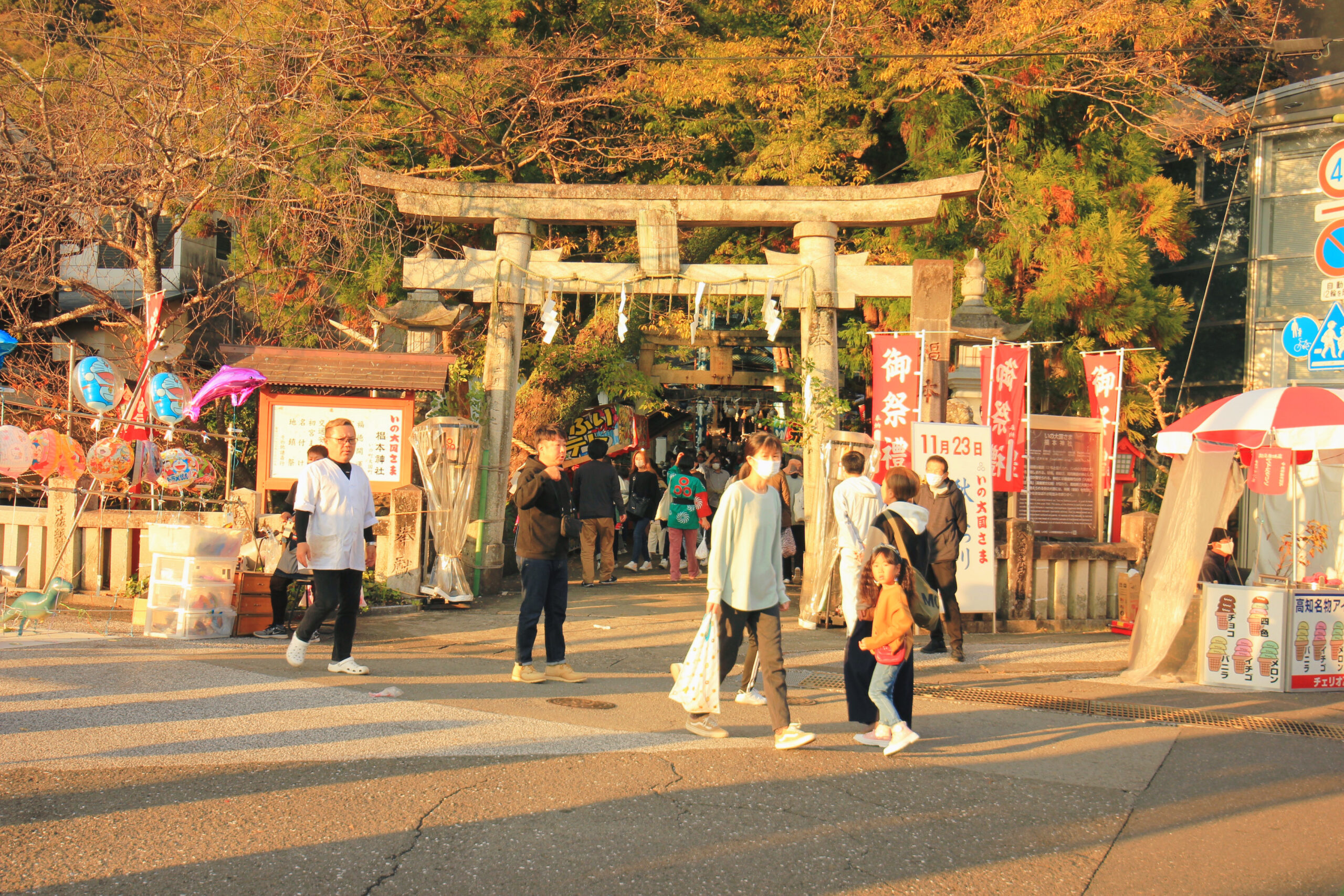 大祭の当日11月23日には、ご神霊をのせたお神輿が神社を出て、お供をする獅子舞や稚児たちと行列をなして町を練り歩く御神幸(ごしんこう)が行われます。そして行列は仁淀川の御旅所(おたびしょ)まで行き、神事や舞を奉納し、五穀豊穣や福徳開運を祈願するというお祭りです。