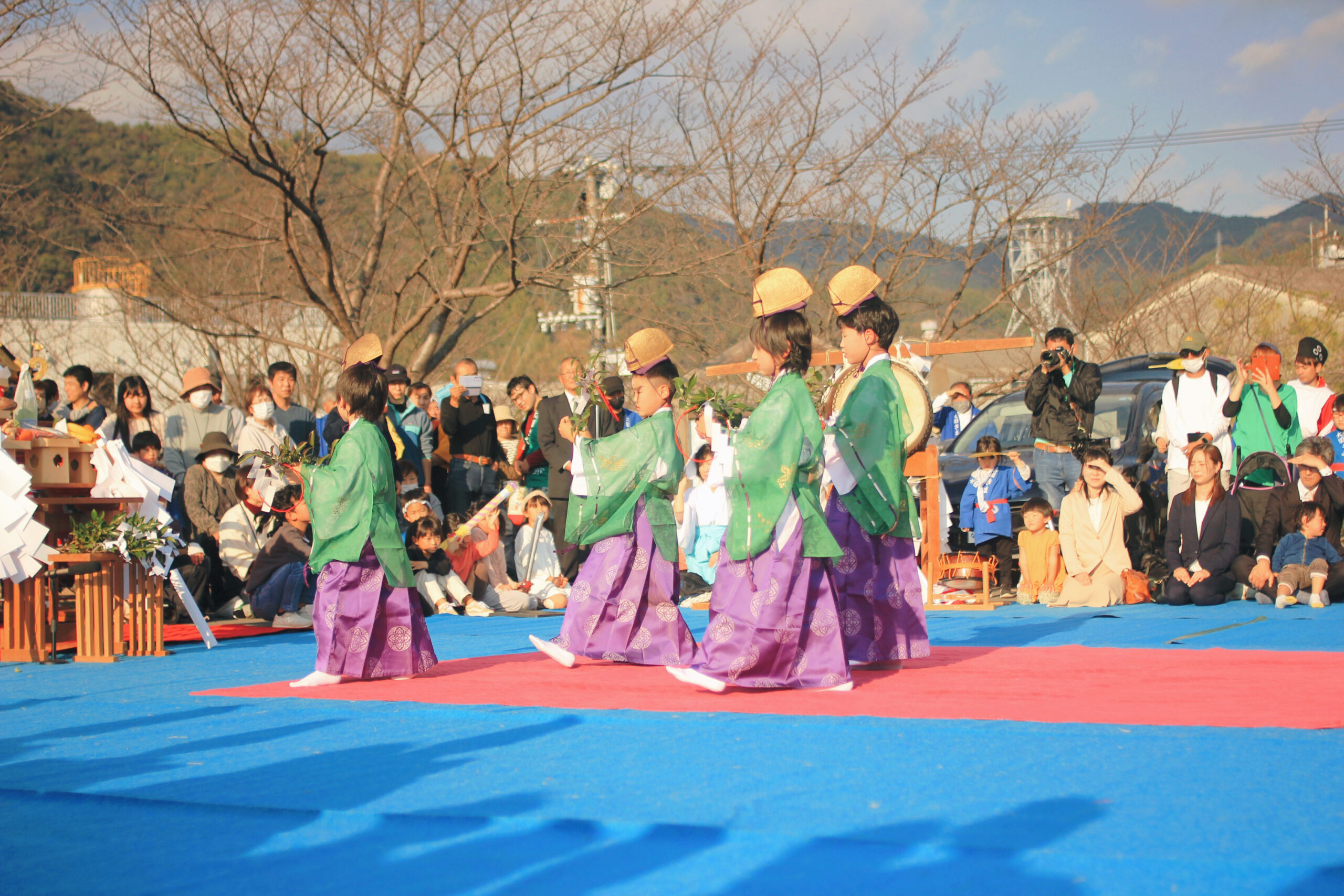 次に、神様をおもてなしする舞の奉納が始まりました。最初は小さな男の子たちによる朝日舞です。